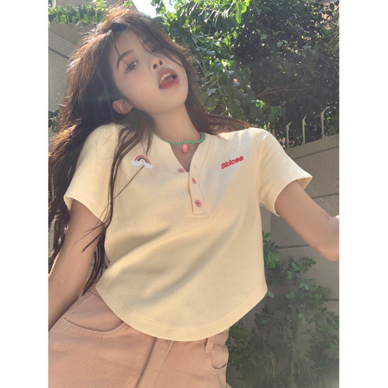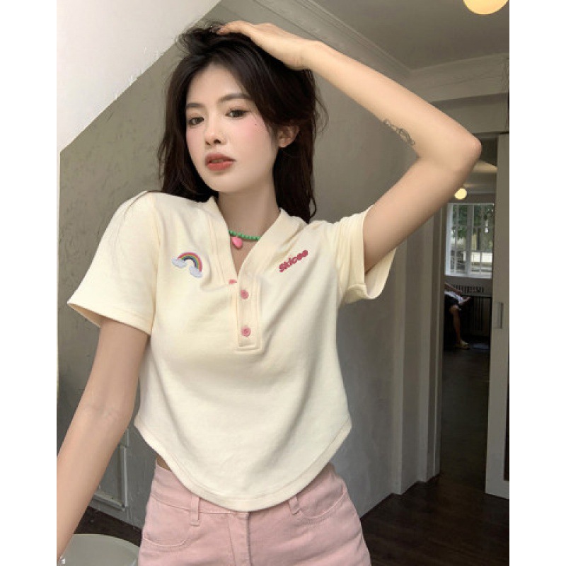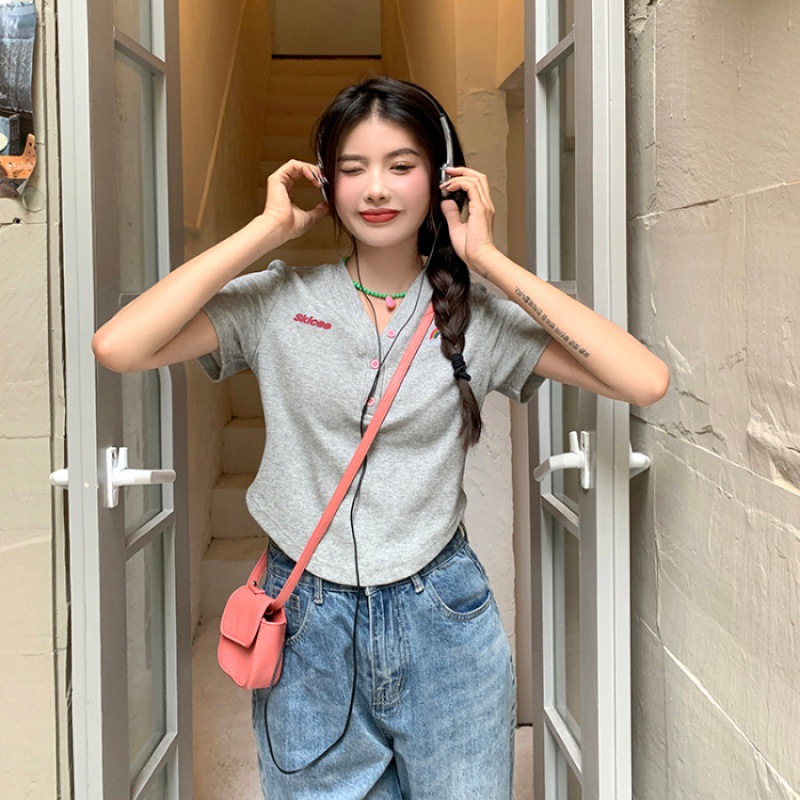 甜辣妹正肩V领短袖t恤女夏小众别致设计感不规则修身显瘦短款上衣