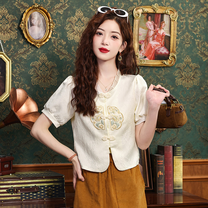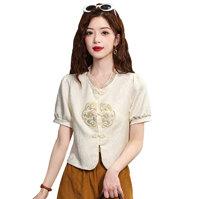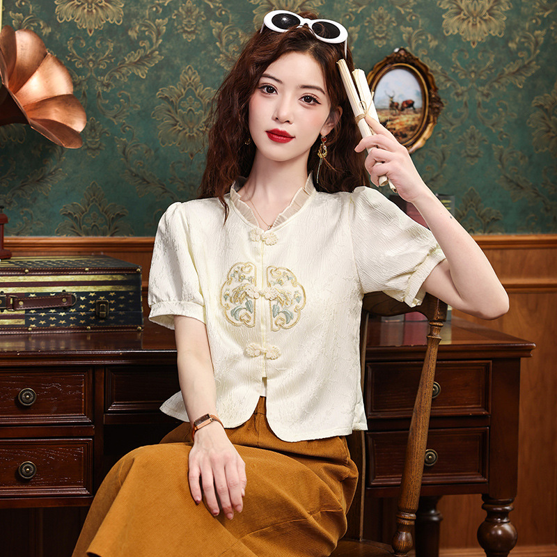 新中式国风盘扣刺绣流苏系带花边领短袖衬衫女夏小众气质提花上衣