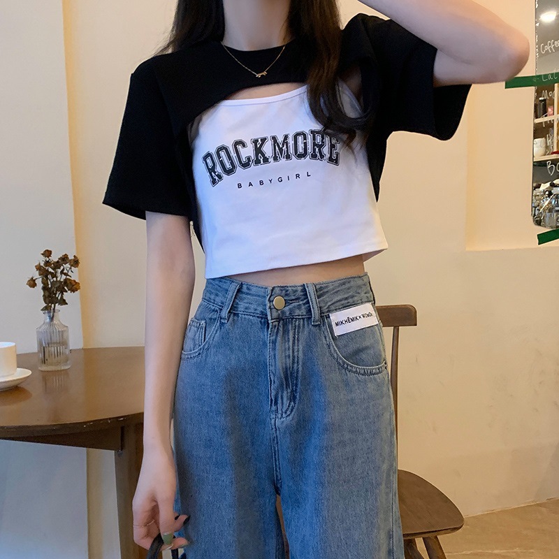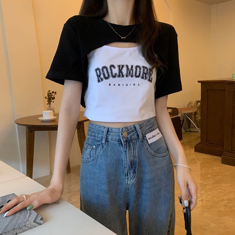 感女夏小众欧美复古印花两件套短袖美式正肩设计T恤辣妹短款上衣