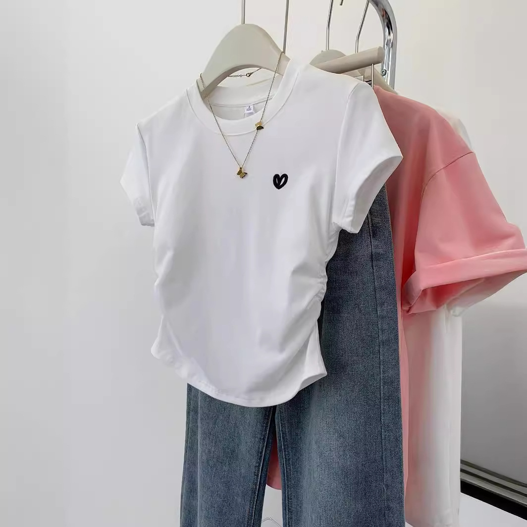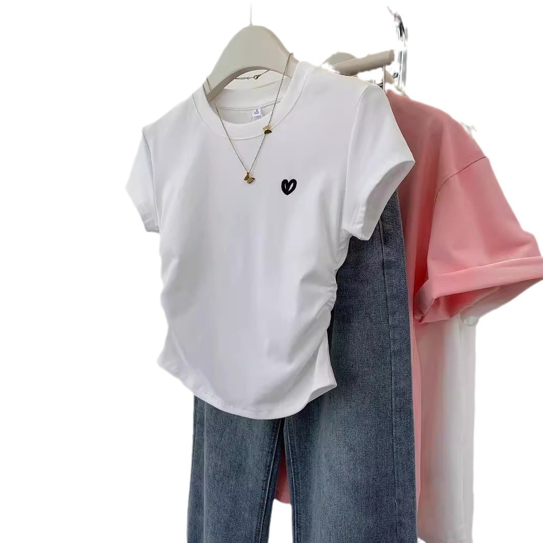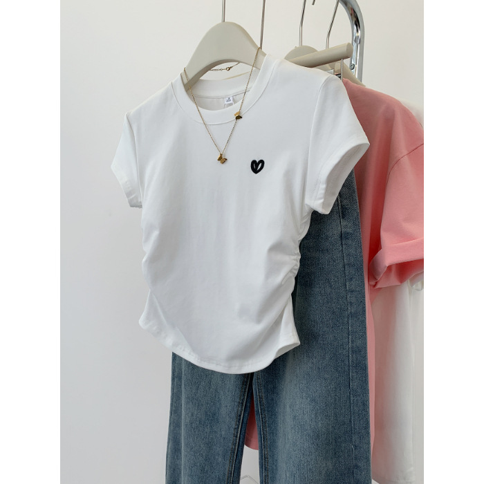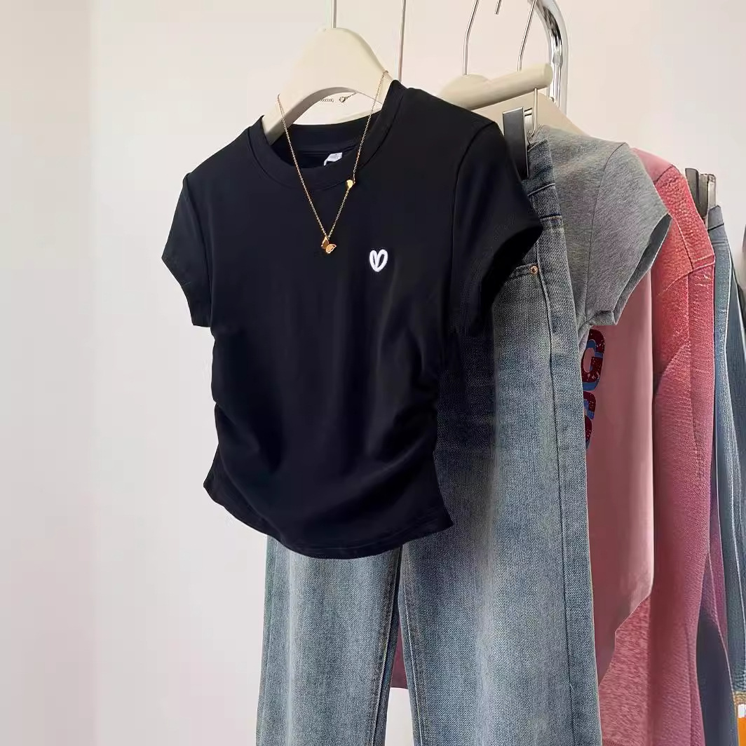 夏季新款设计感黑色短款爱心刺绣短袖t恤女正肩体恤修身上衣