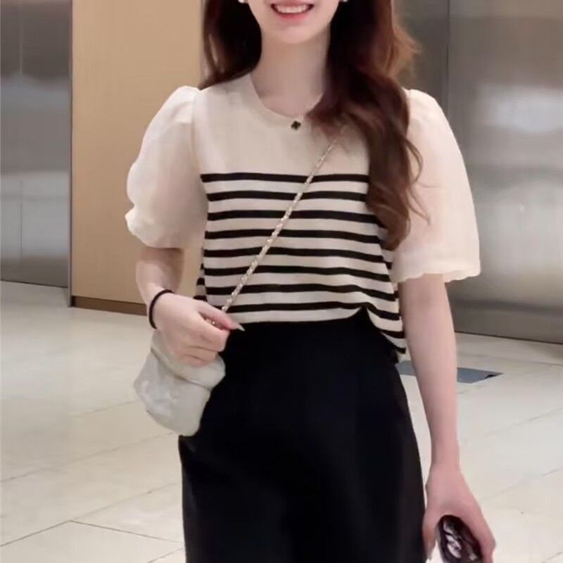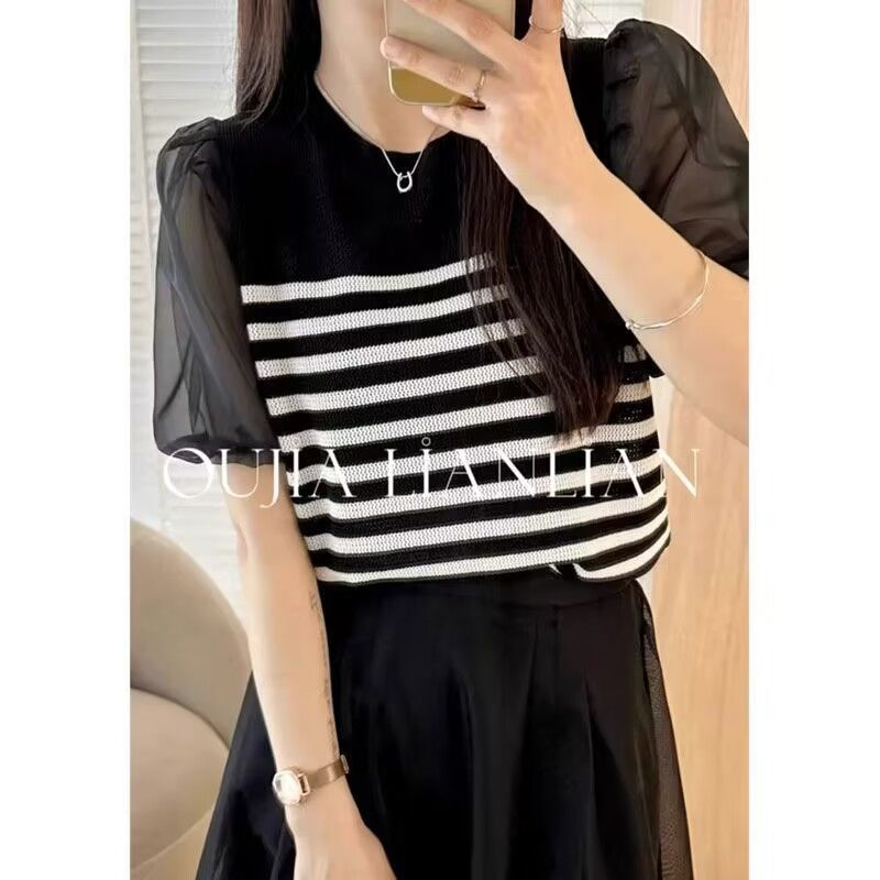 冰丝针织短袖t恤女薄款夏季新款修身显瘦时尚减龄泡泡袖体恤上衣