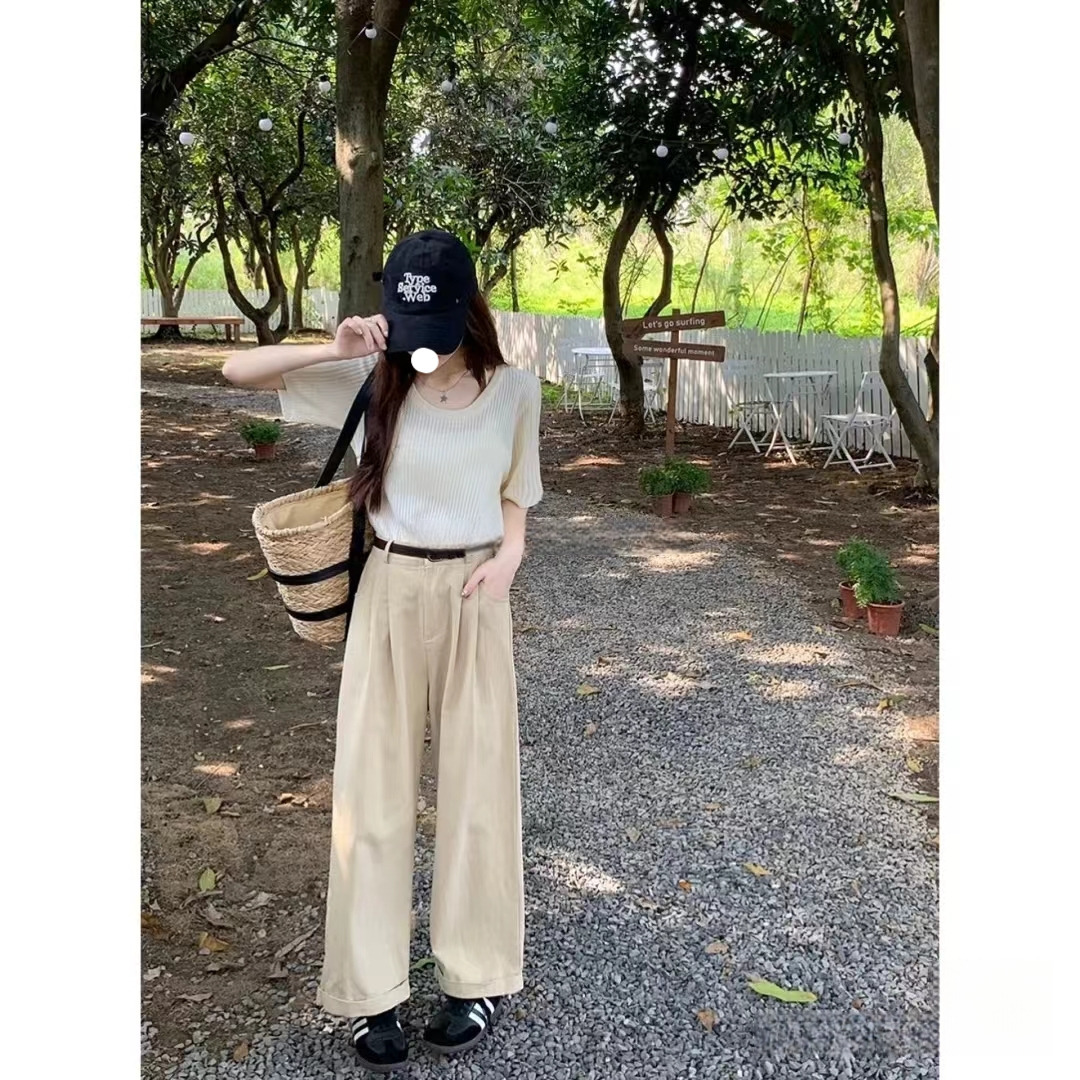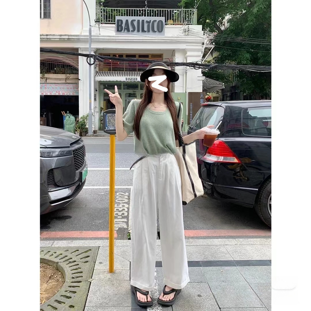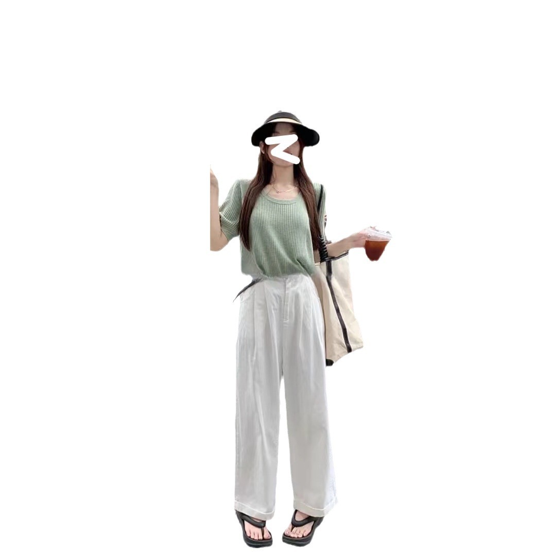 冰丝短袖针织t恤女夏小众领感体恤u夏季上衣小个子针织衫正肩设计