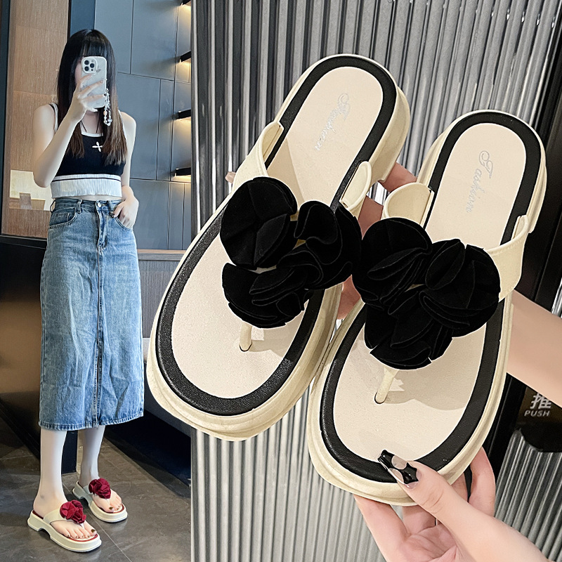 夏季休闲女百搭仙女凉拖鞋外穿厚底夹趾花朵韩版增高人字拖