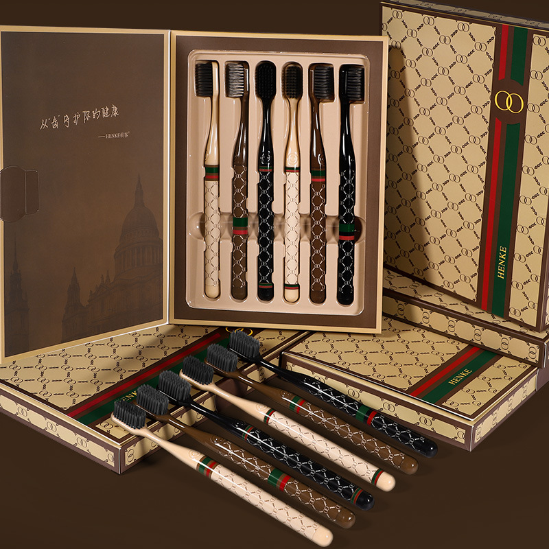 【6支礼盒装】爆品轻奢牙刷家用超细中性毛成人宽头高颜值印花手