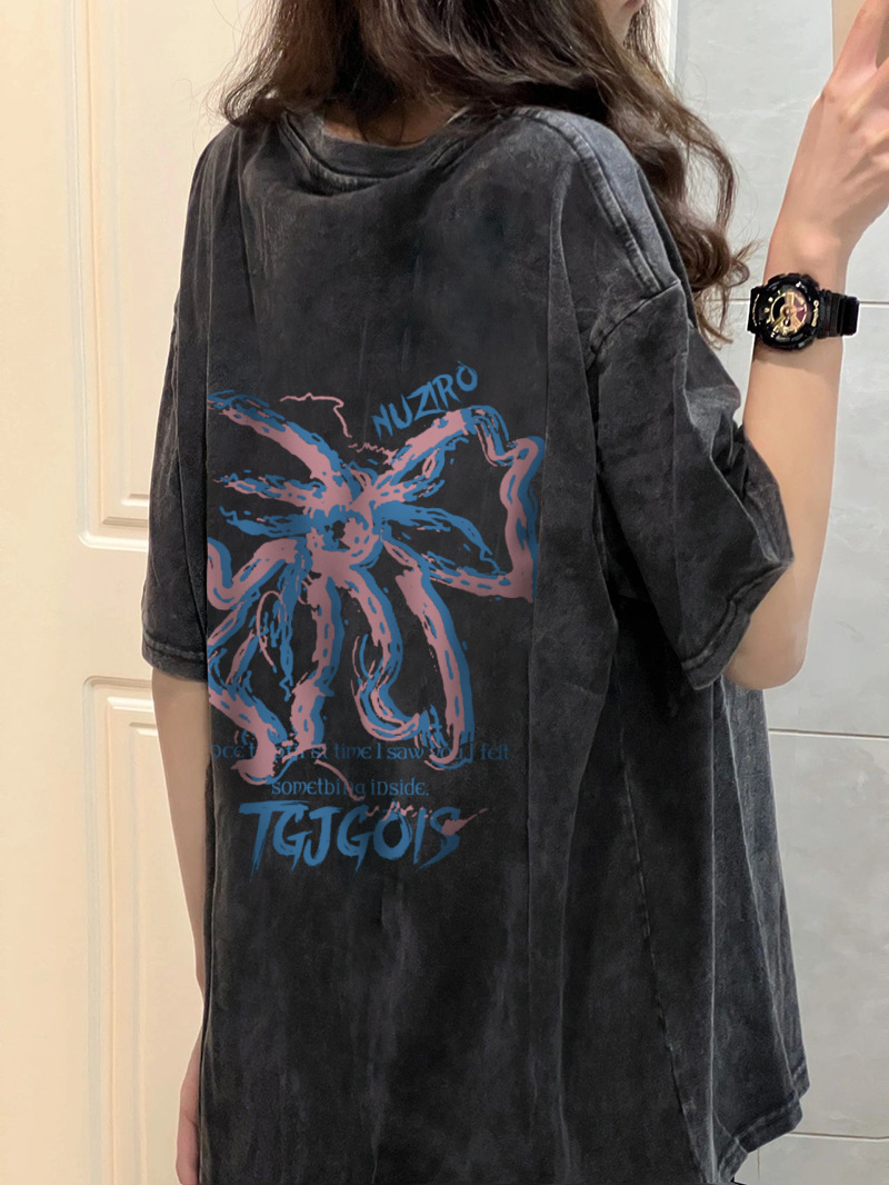 夏季纯棉水洗做旧短袖T恤女新款美式复古嘻哈oversize百搭上衣潮