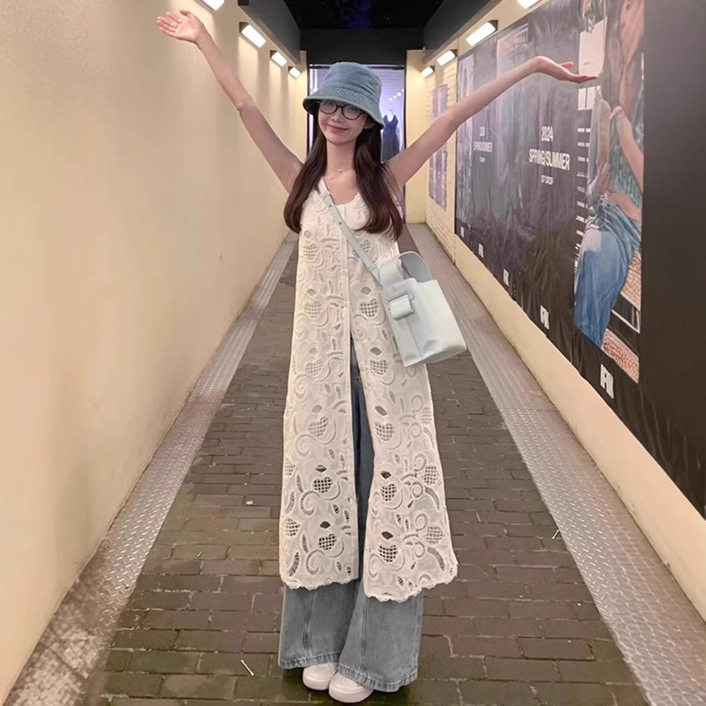 法式镂空钩花背心连衣裙女开叉叠穿设计感春夏季新款无袖罩衫长款