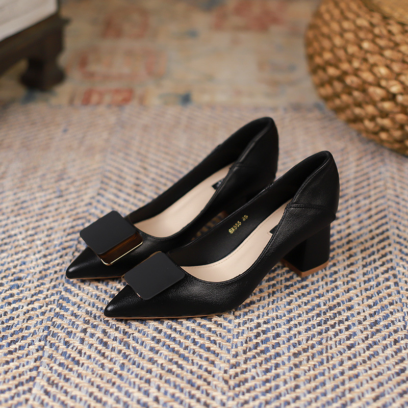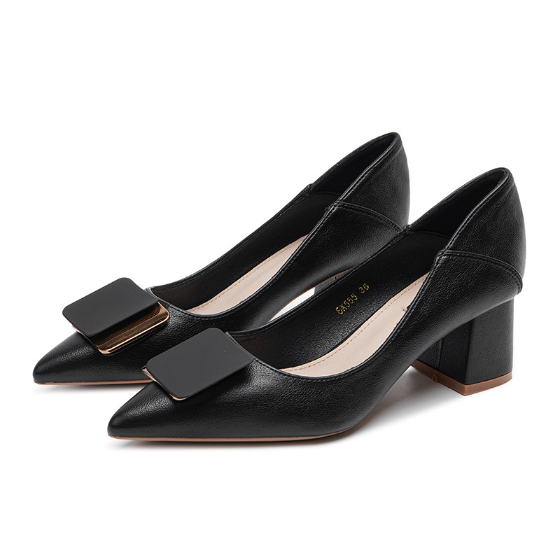 555-10尖头粗跟高跟鞋新款职业工作方扣鞋两穿单鞋设计感小众