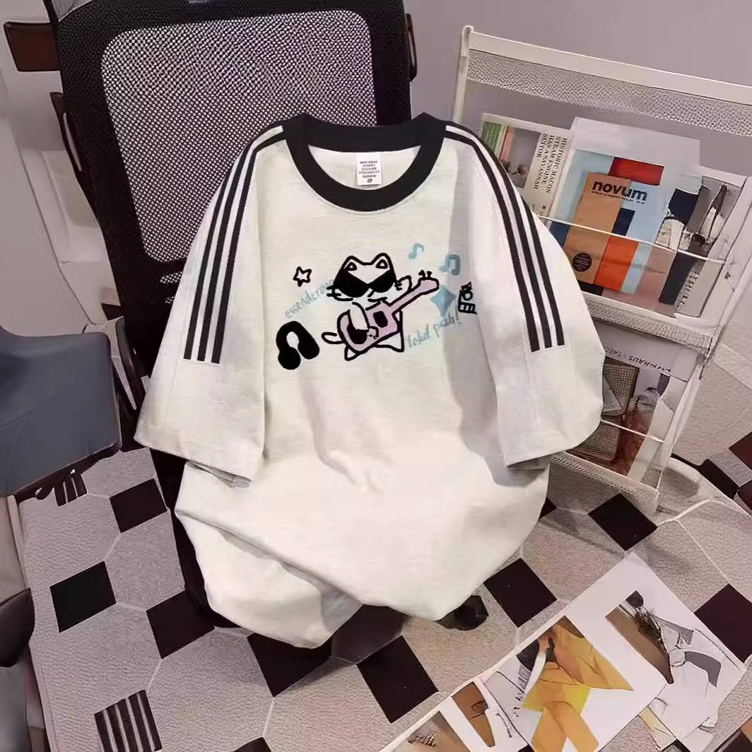 美式纯棉重磅卡通猫咪印花短袖t恤女夏季新款宽松三条杠情侣上衣