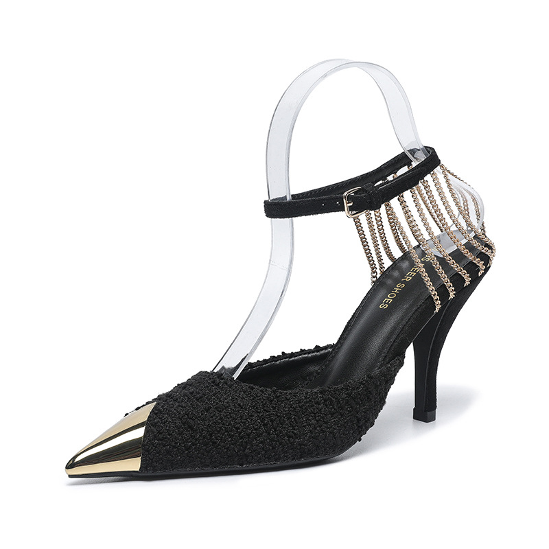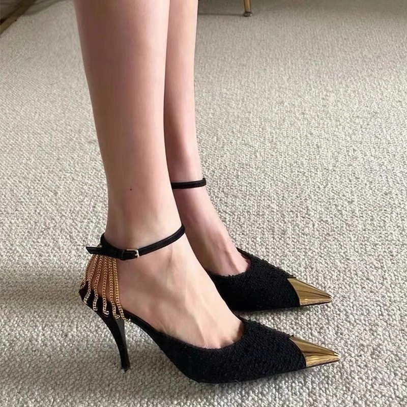 rose朴彩英同款链条高跟鞋新款金属小香风毛呢爆款细跟单鞋