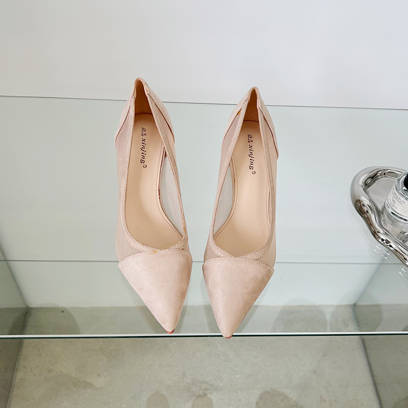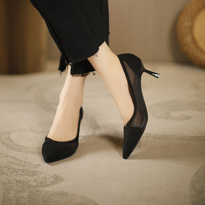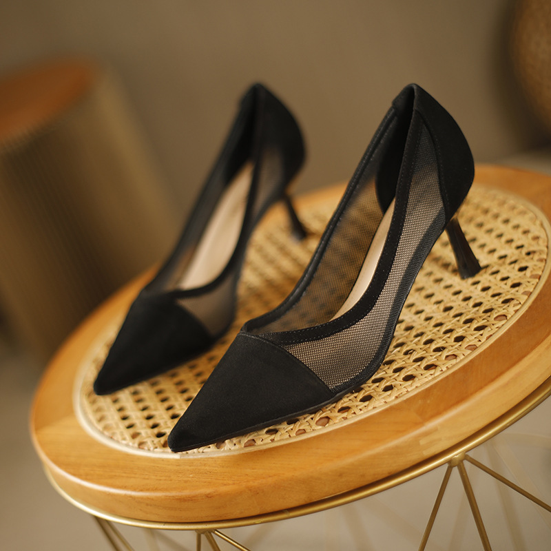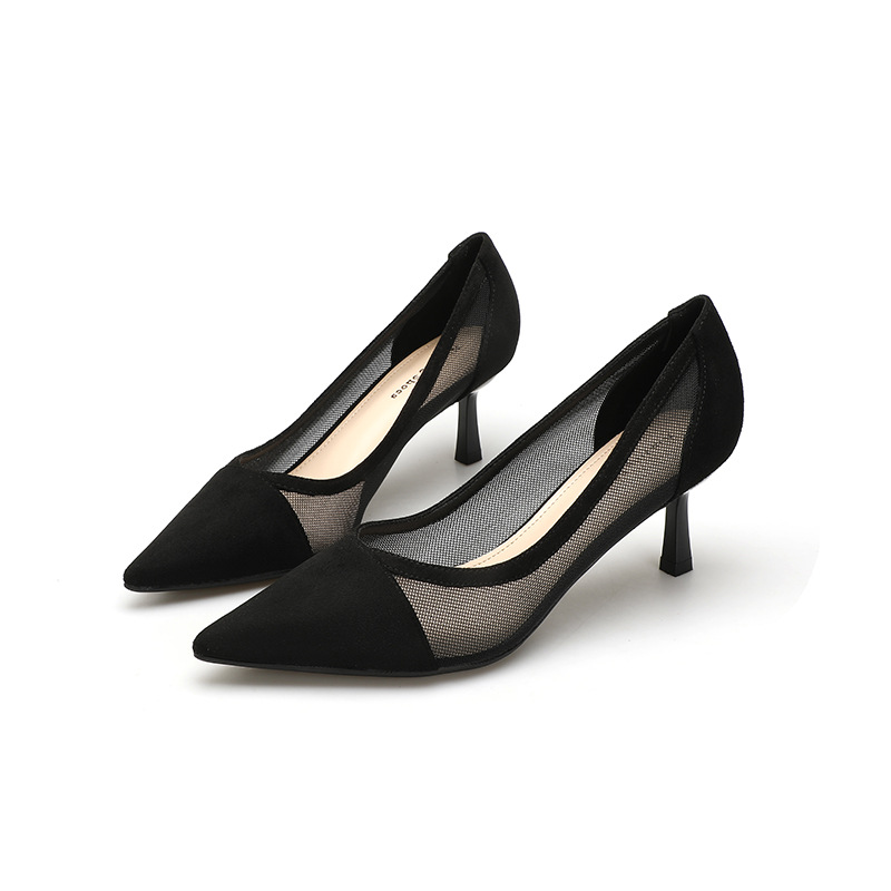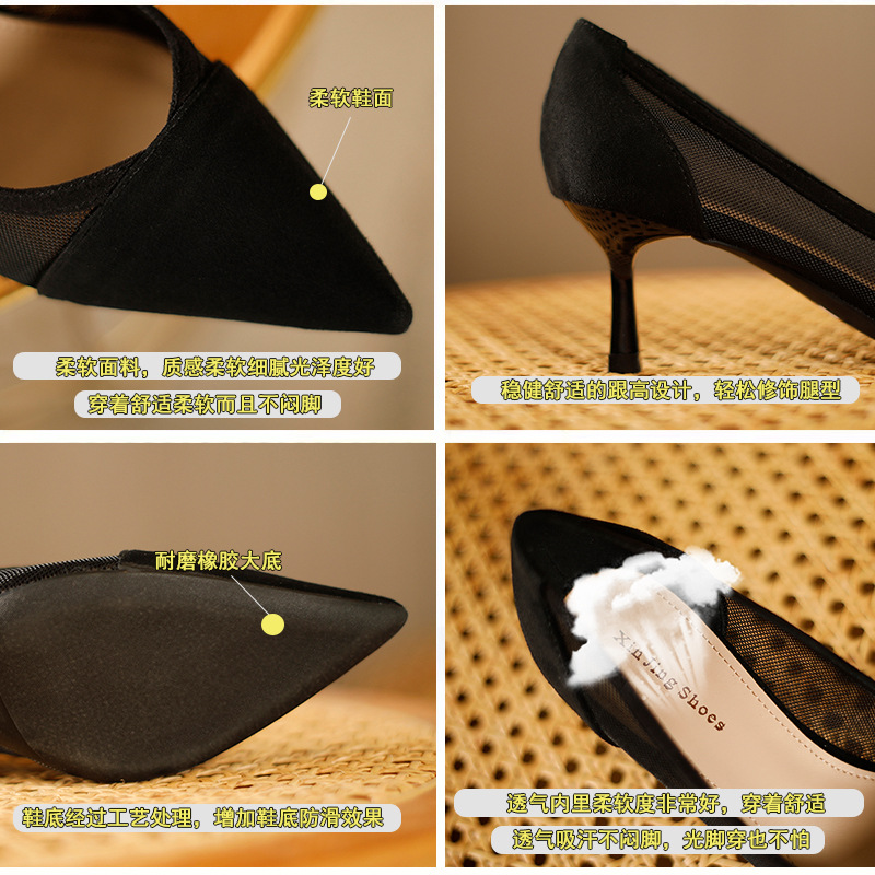 100-2透气网纱蕾丝一脚蹬单鞋欧美尖头时尚女鞋简约包头高跟鞋