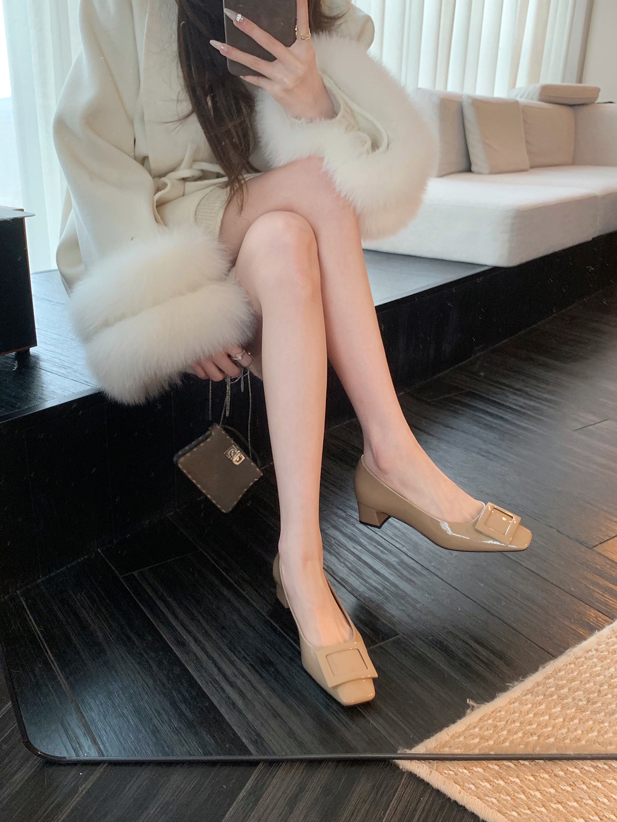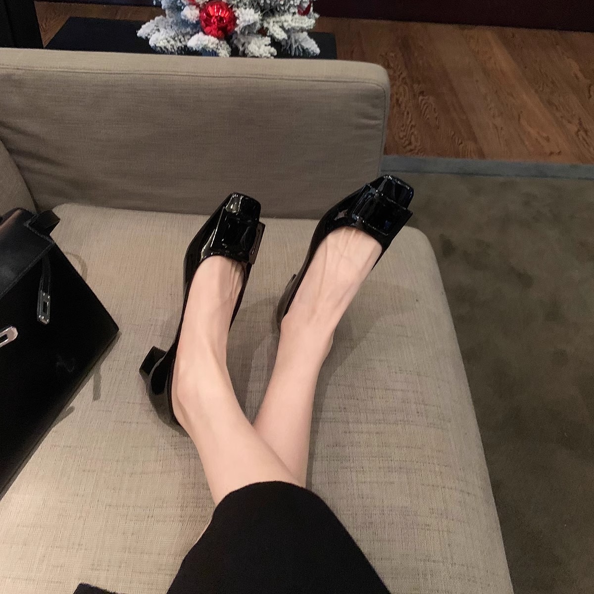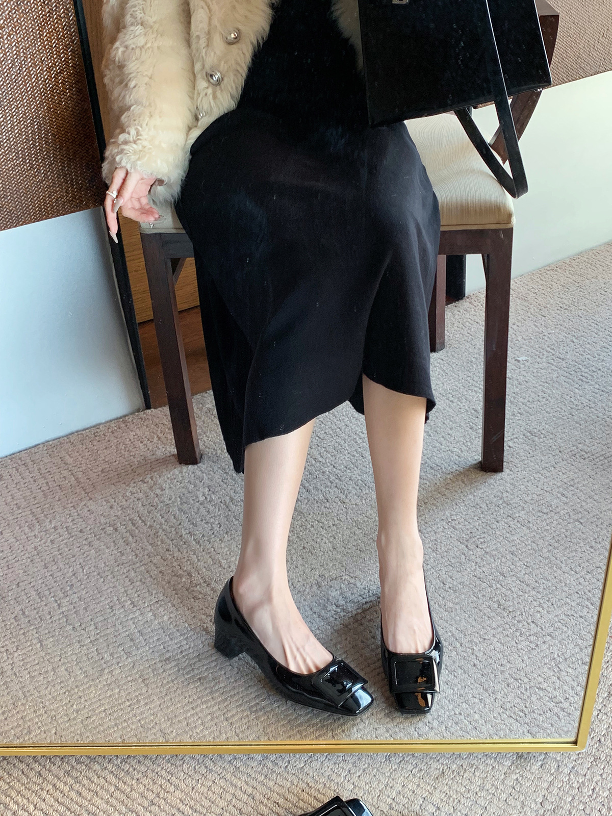 葡萄妈同款高跟鞋女新款方头漆皮粗跟浅口单鞋方扣通勤气质女