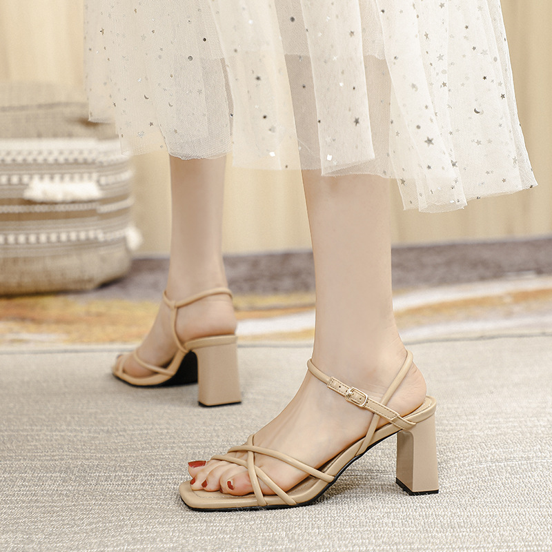 TEAHOO女鞋夏季韩版仙女黑色气质方头粗高跟鞋时尚罗马凉鞋
