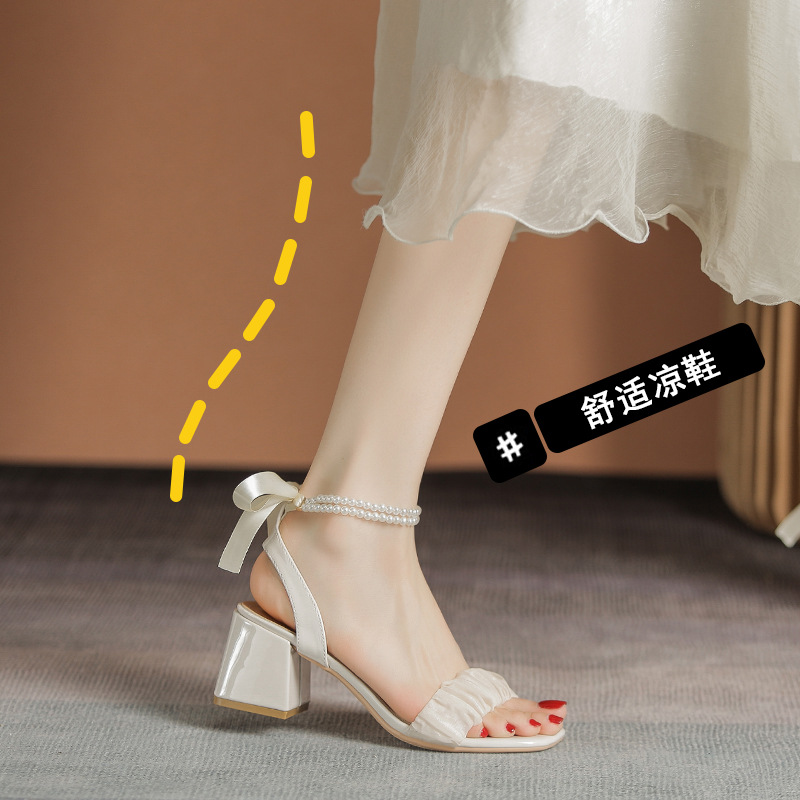 法式凉鞋女夏季时尚交叉绑带蝴蝶结仙女风珍珠高跟设计感小众粗跟