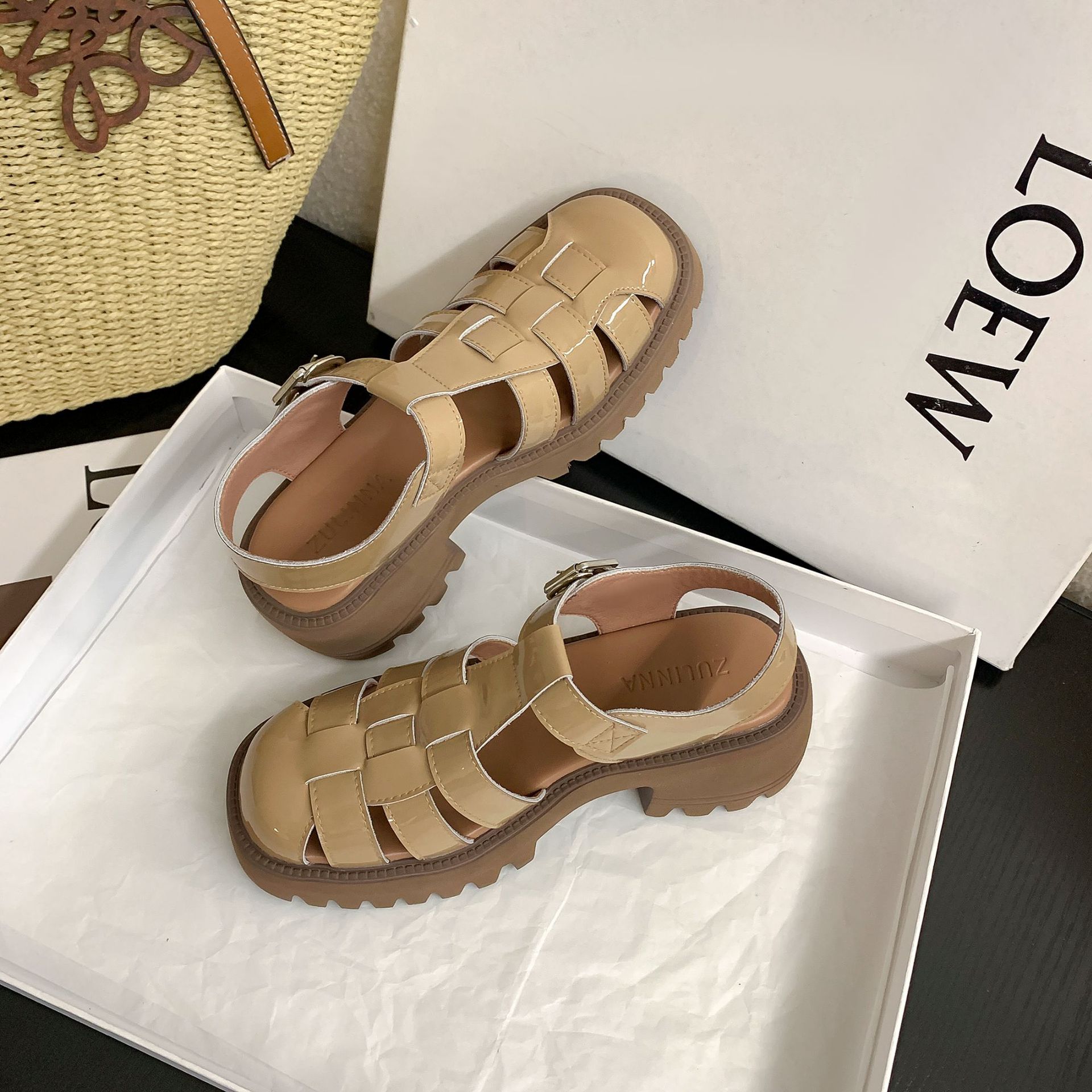 包头罗马凉鞋女新款夏季松糕女鞋粗跟高跟复古镂空编织猪笼鞋
