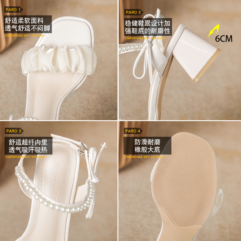 粗跟凉鞋女夏季新款仙女风蝴蝶结方头珍珠一字扣带高跟凉鞋女