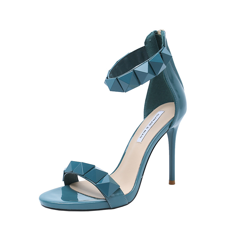 时尚漆皮一字带细跟凉鞋女年新款性感大铆钉露趾高跟鞋女夏季