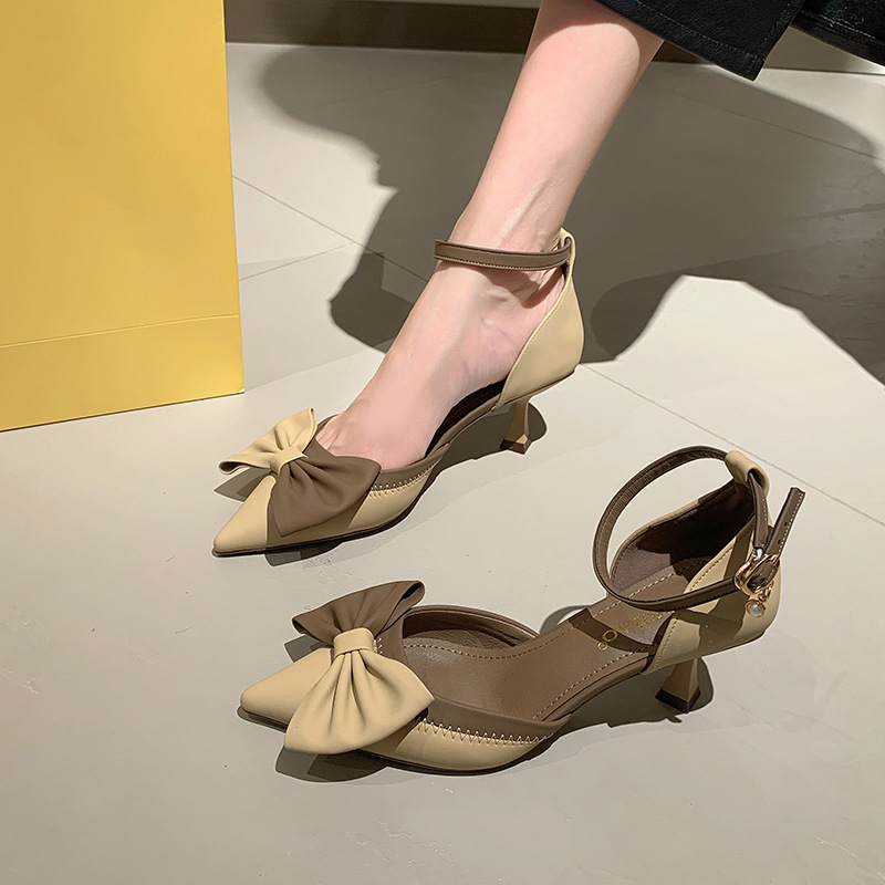 高跟鞋女细跟夏季新款法式复古蝴蝶结气质尖头浅口中空单鞋