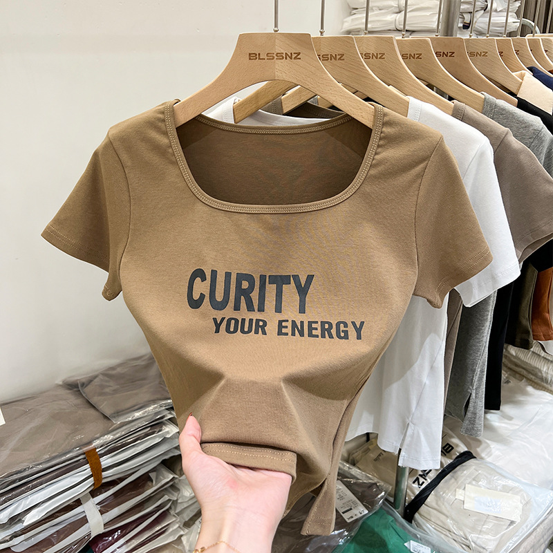 不规则开叉短袖t恤女夏季新款美式复古锁骨方领短款上衣体恤