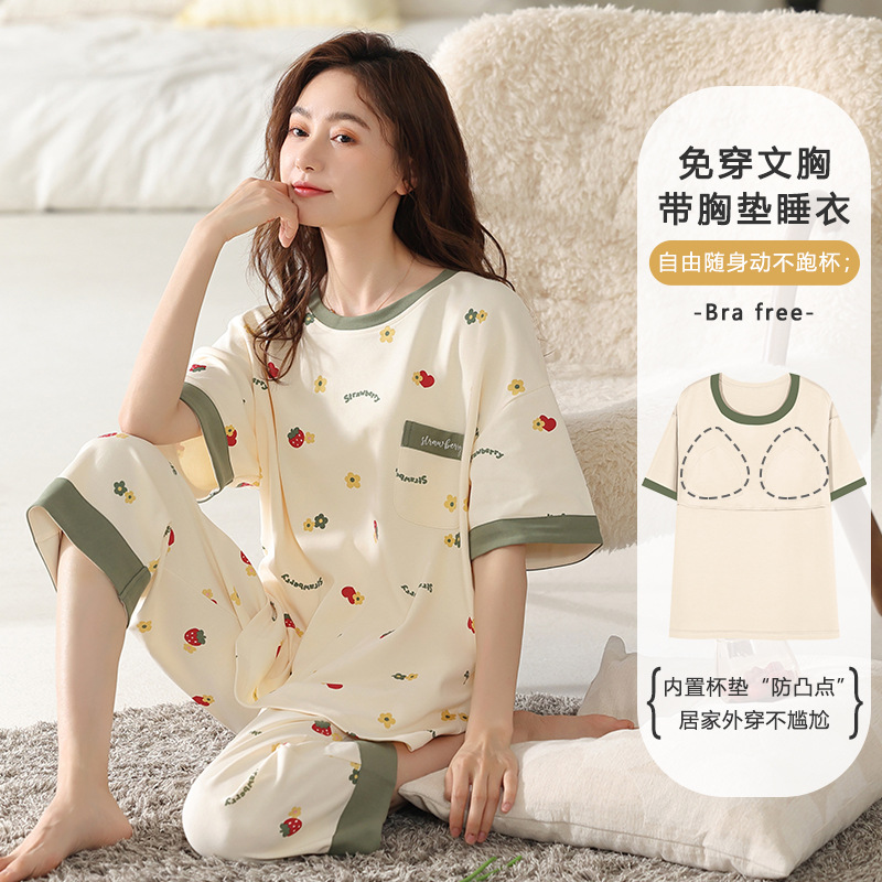 带胸垫睡衣女款夏季纯棉短袖七分裤休闲可外穿免穿文胸全棉家居服