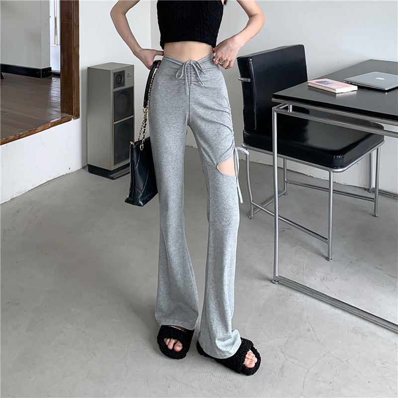 灰色小个子裤子女设计感小众ins潮百搭夏季破洞抽绳微喇裤休闲裤
