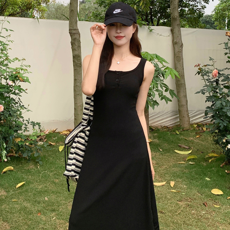 实拍现货~黑色方领连衣裙女夏季小个子显瘦吊带包臀裙背心长裙
