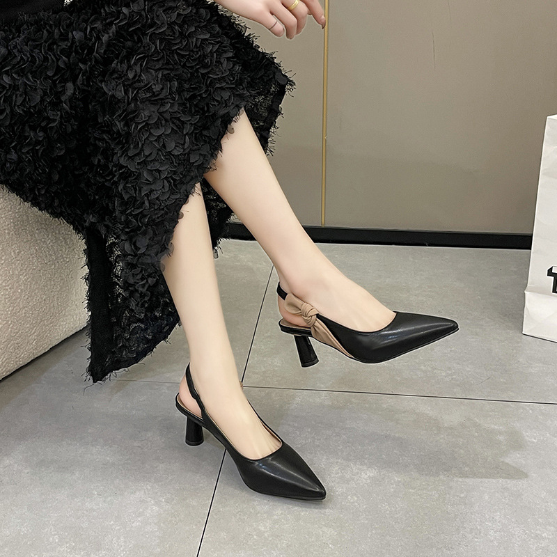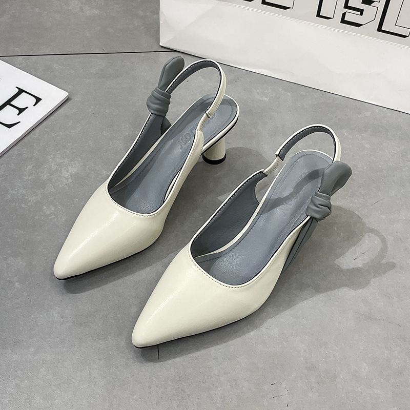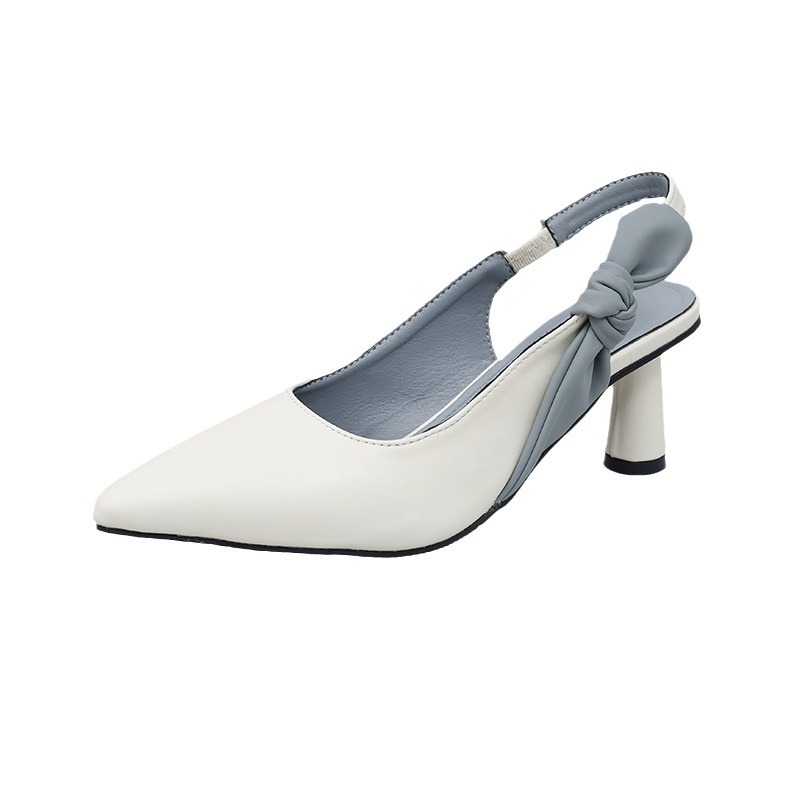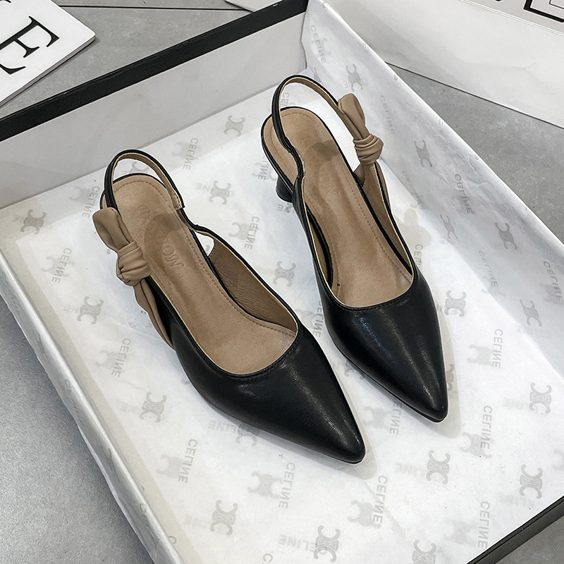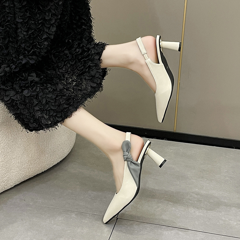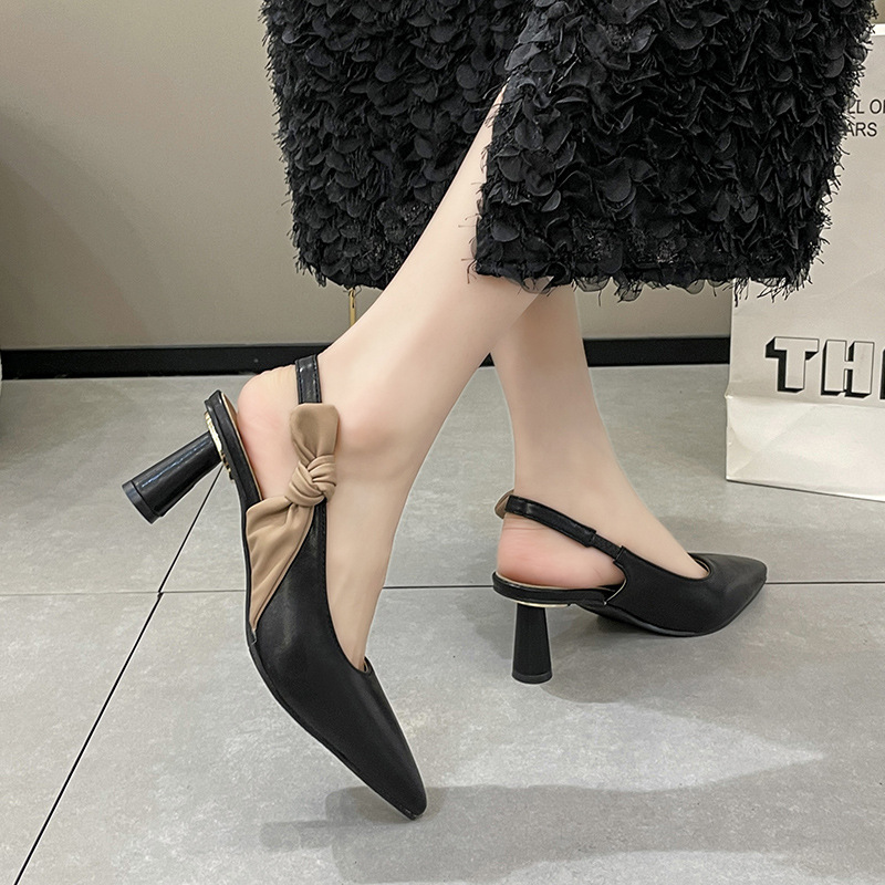 时尚粗跟拼色高跟鞋女新款百搭尖头后绊带单鞋蝴蝶结包头凉鞋