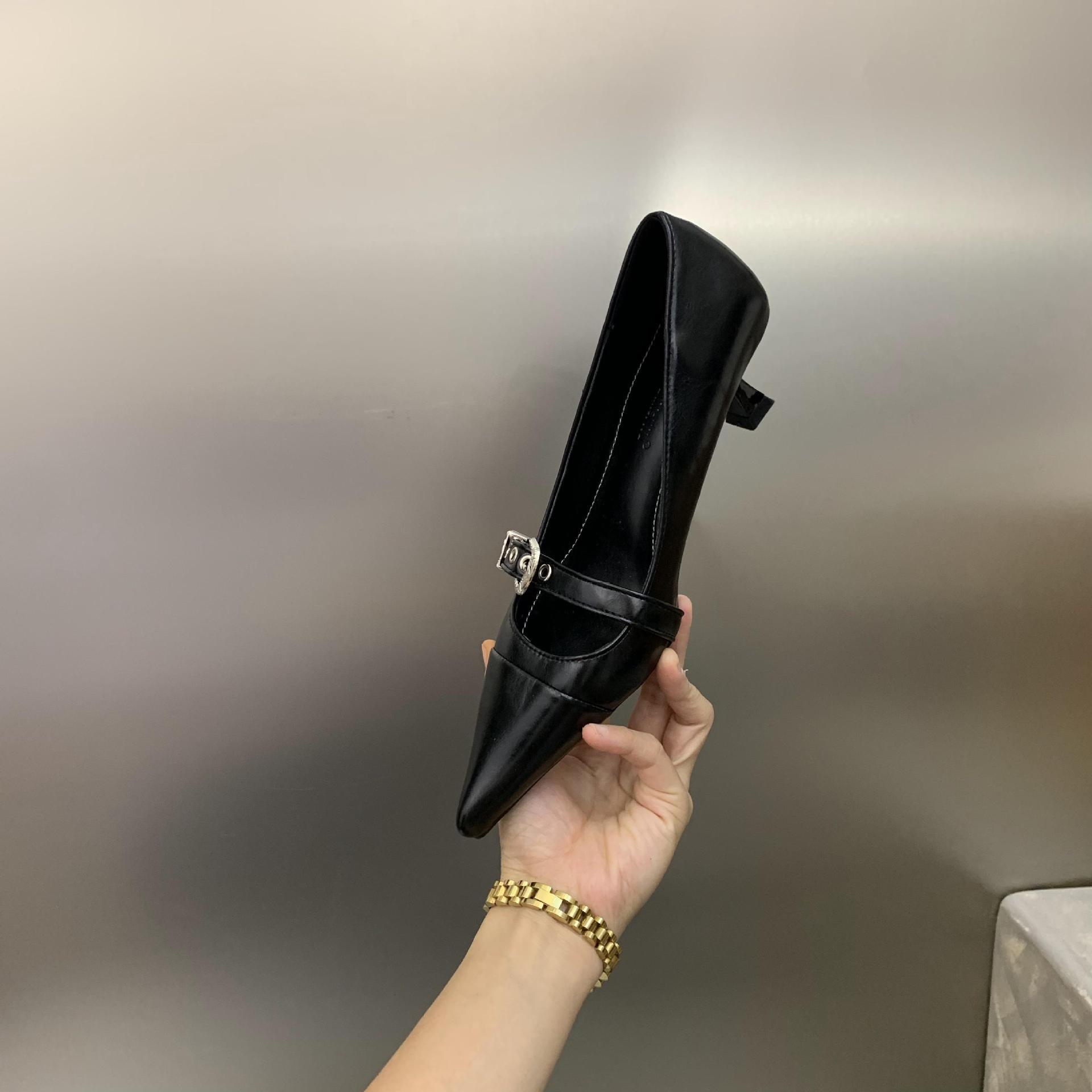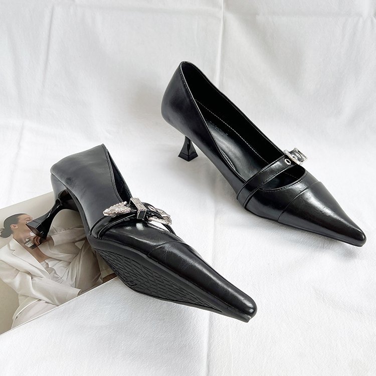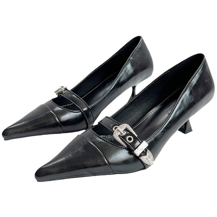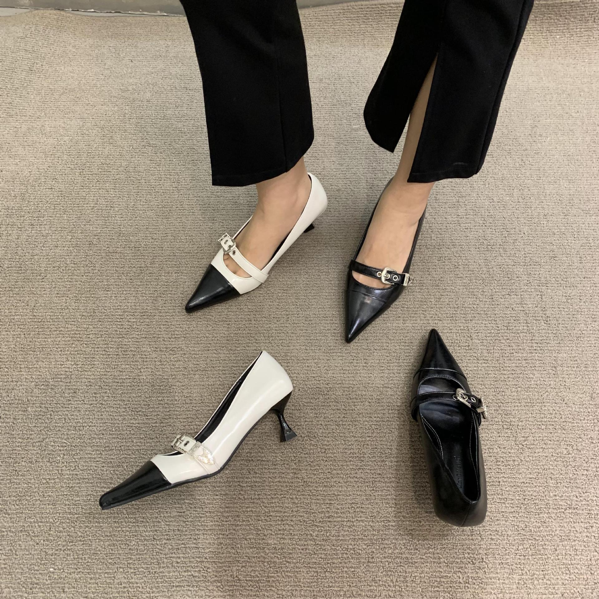 法式尖头浅口单鞋女春季新款复古拼色一字扣带玛丽珍鞋细跟高跟鞋