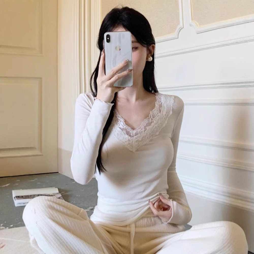 小众设计感蕾丝德绒打底衫女2025年春秋冬纯欲V领大衣内搭小衫潮