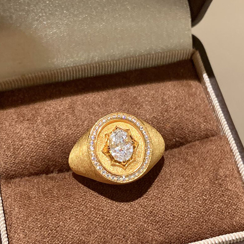 小红书爆款拉丝印章戒指2025新款Vintage中古风满钻精致鸽子蛋指
