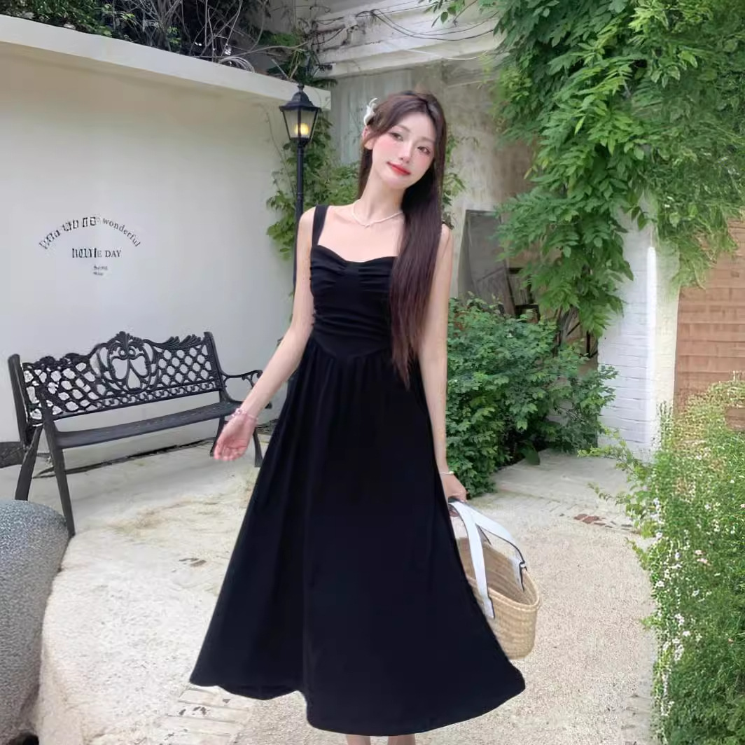 法式赫本风高级感宴会黑色吊带连衣裙女夏气质收腰显瘦无袖长裙子
