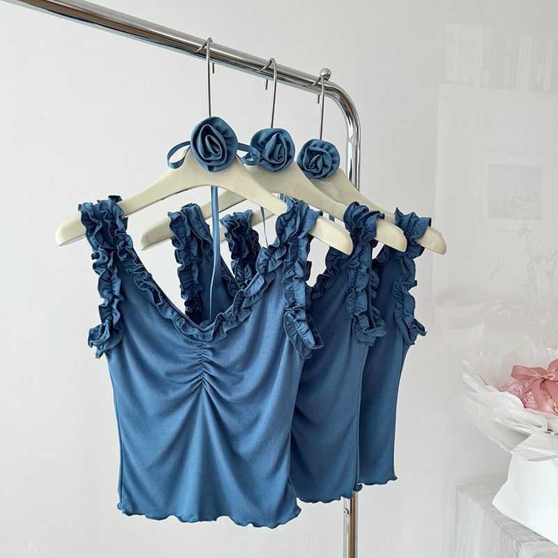 夏季新款辣妹性感蓝色V领吊带背心女木耳边上衣+花朵