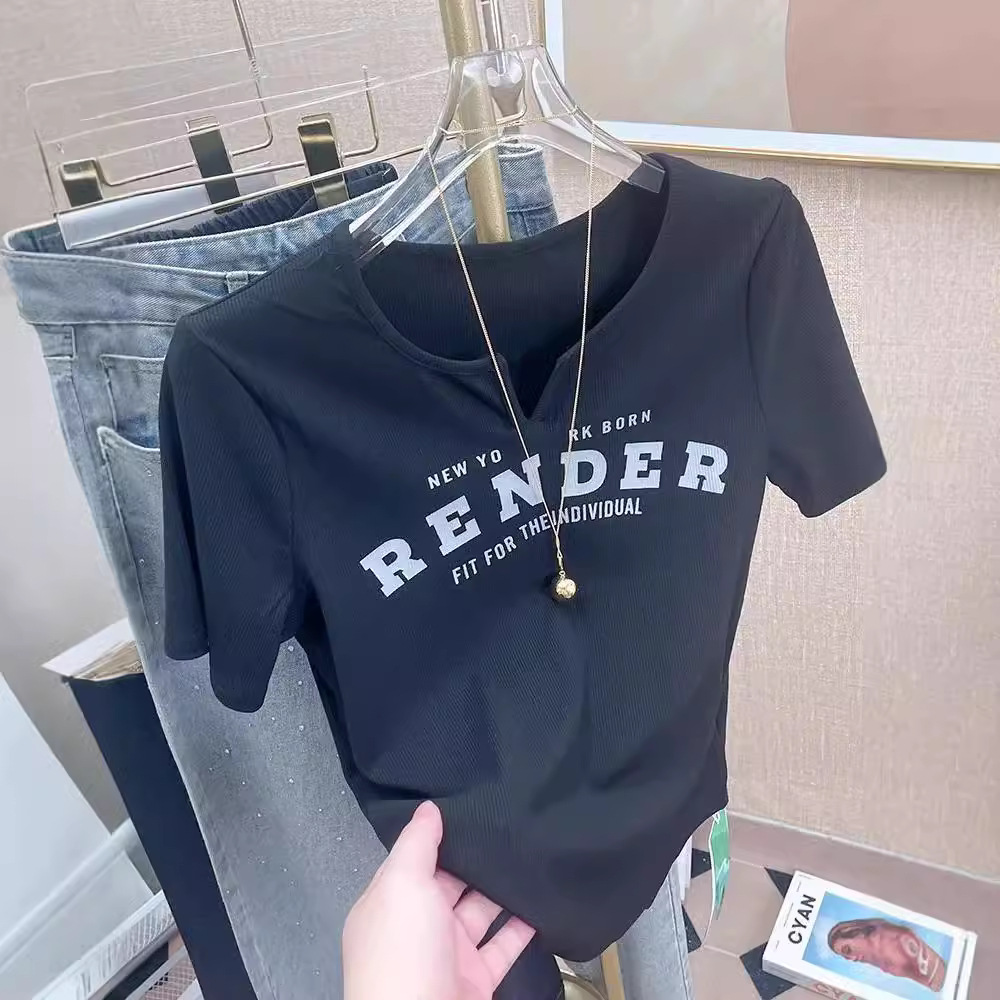 美式复古字母印花v领短袖T恤女夏装韩版新款百搭洋气辣妹短款上衣