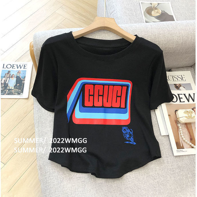 黑色短袖T恤女夏季薄款设计感小众韩版简约字母印花显瘦短款上衣