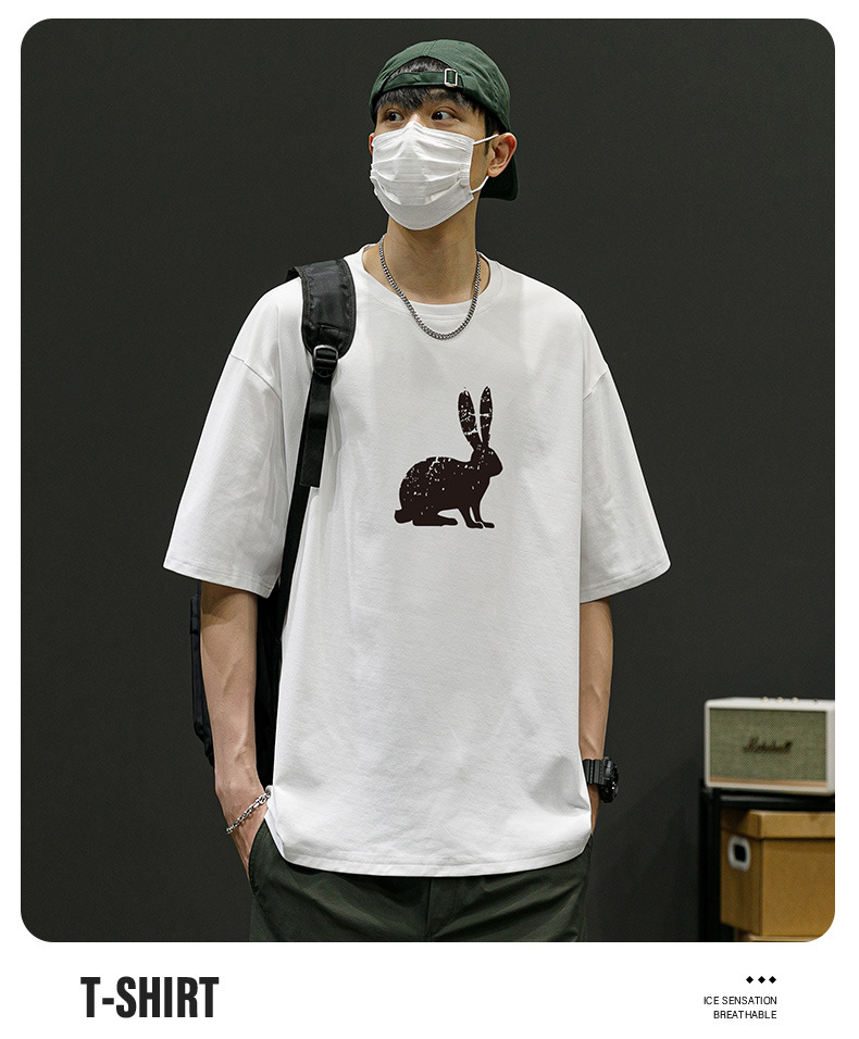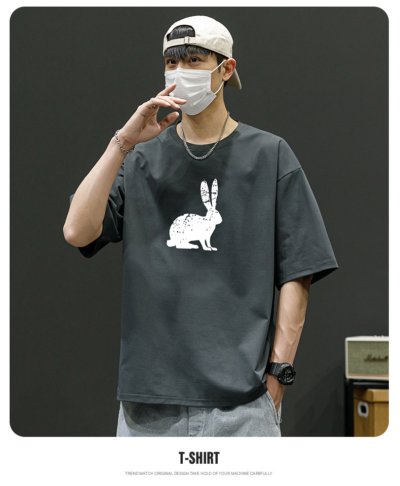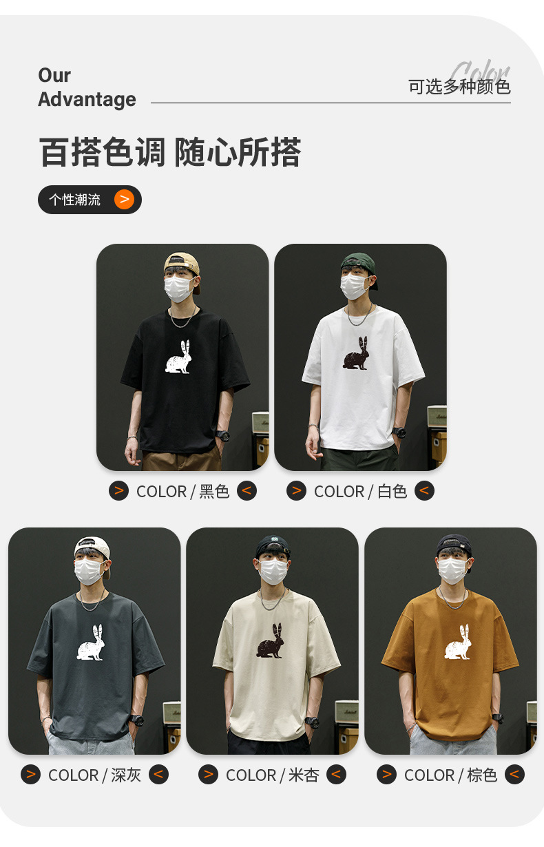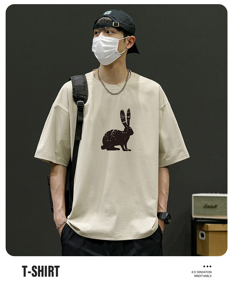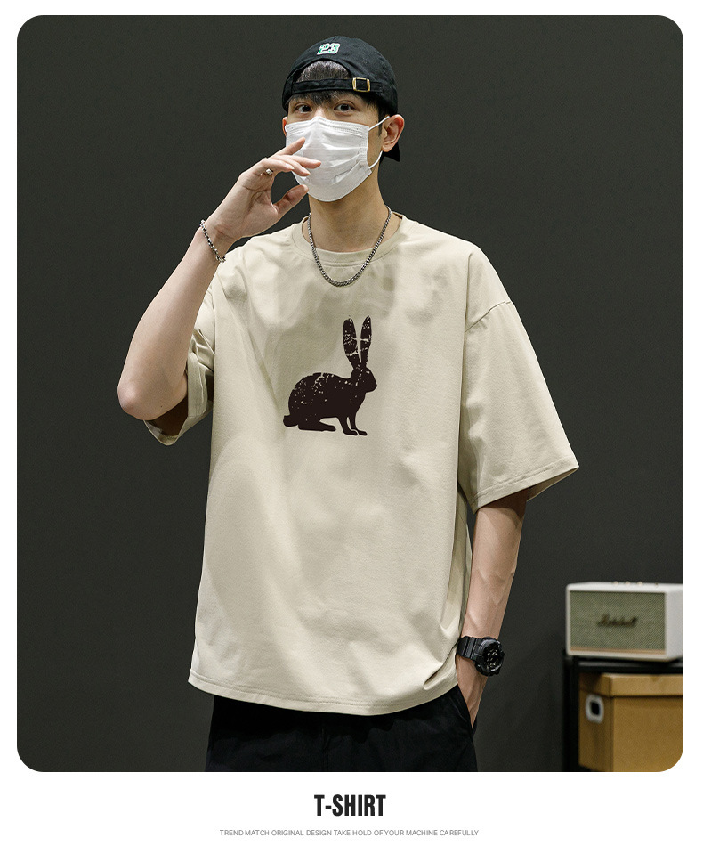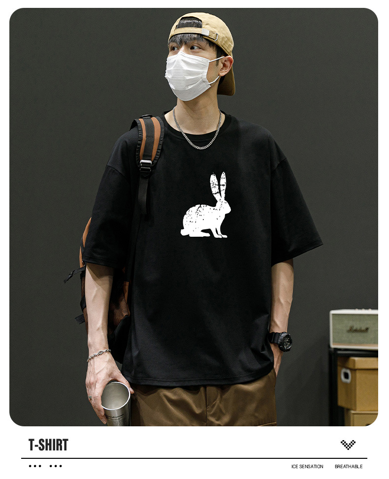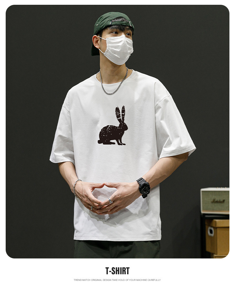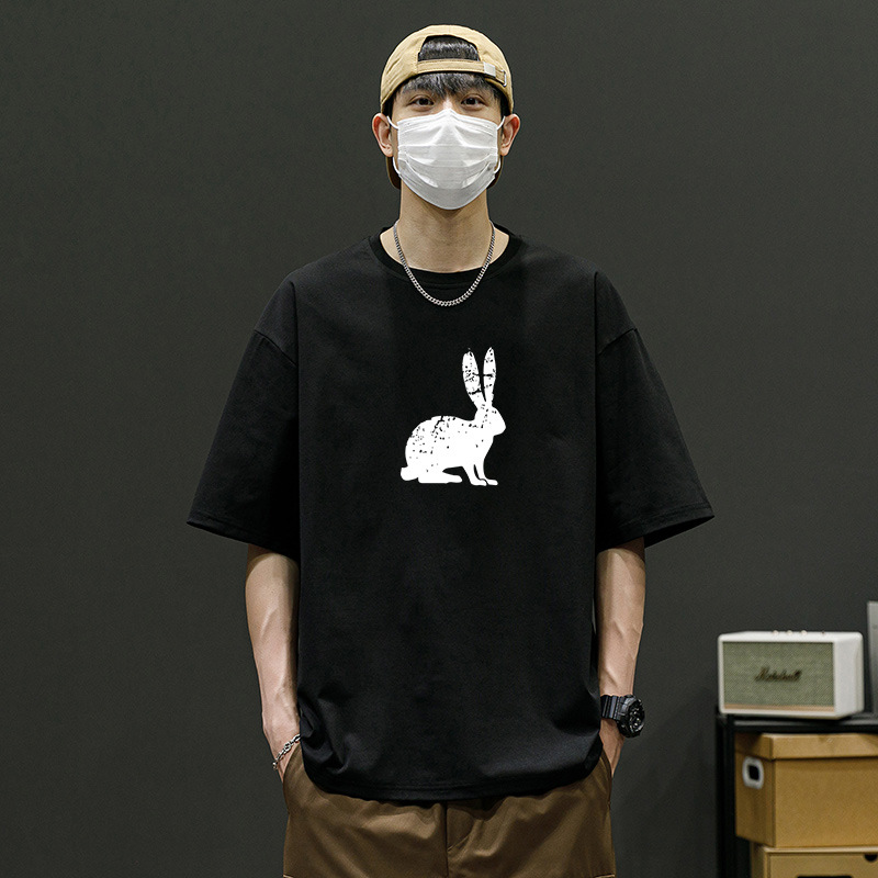 夏季情侣套头圆领短袖T恤男士兔子休闲宽松重磅落肩白色港风打底t