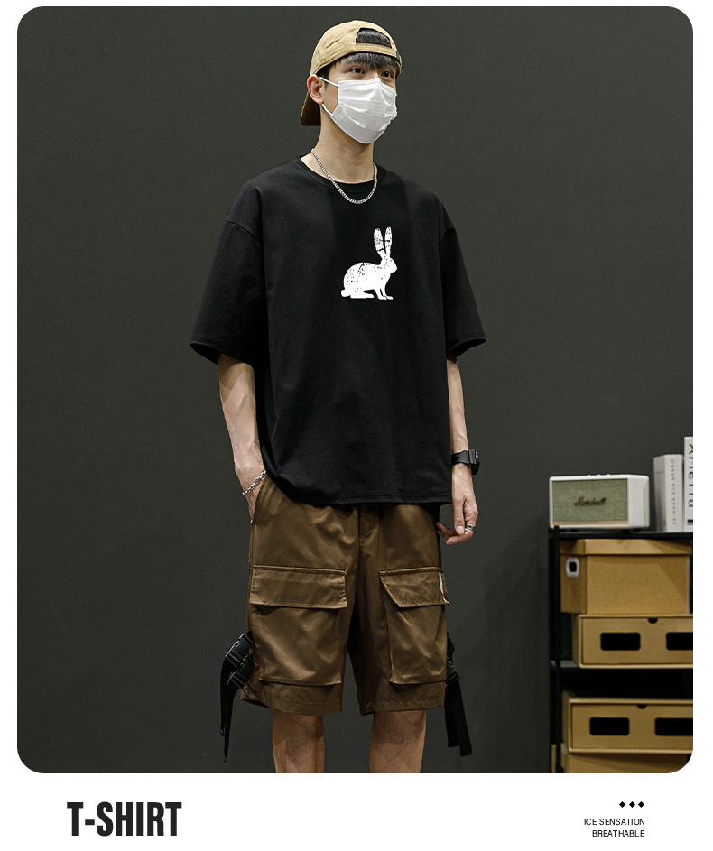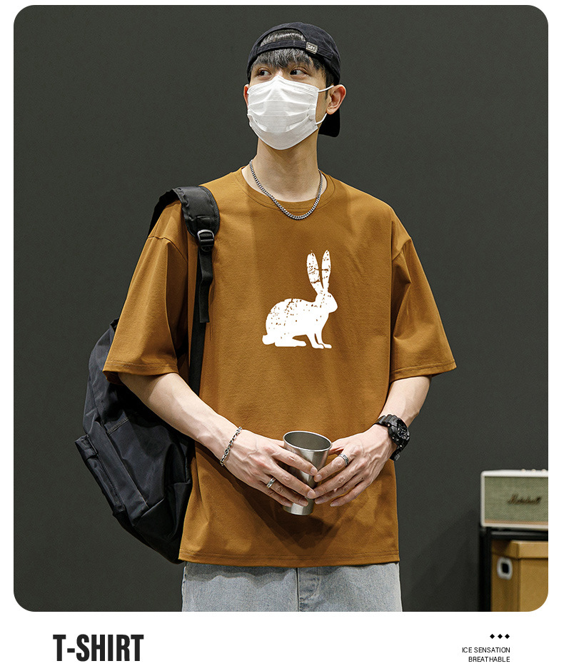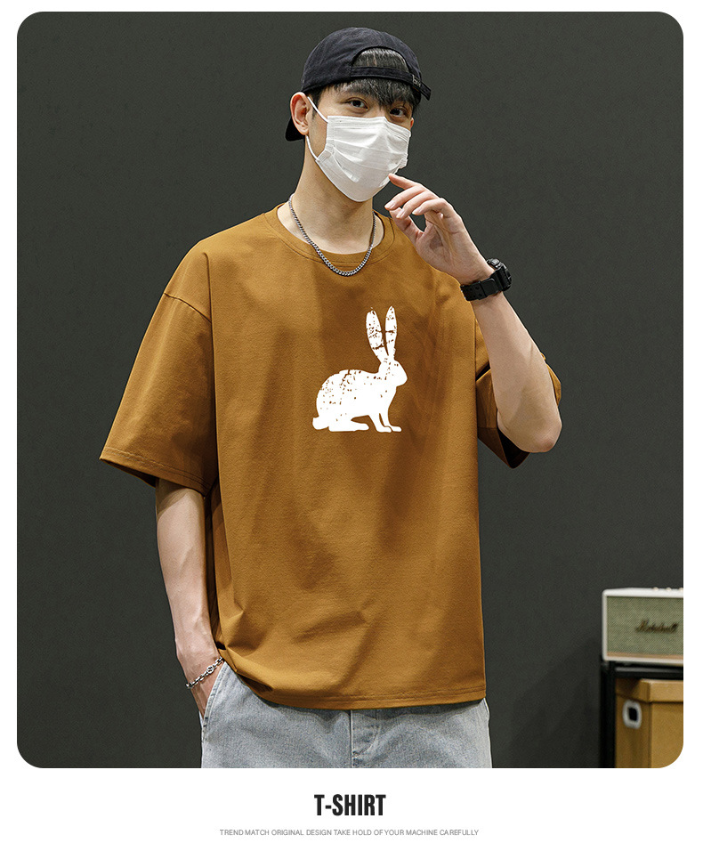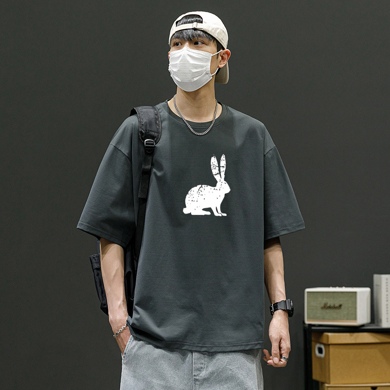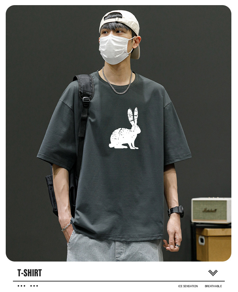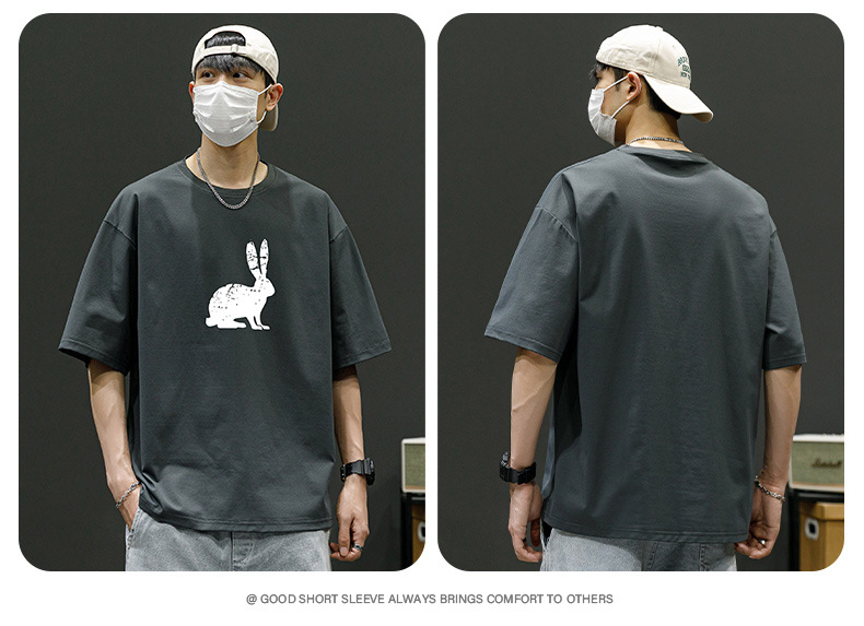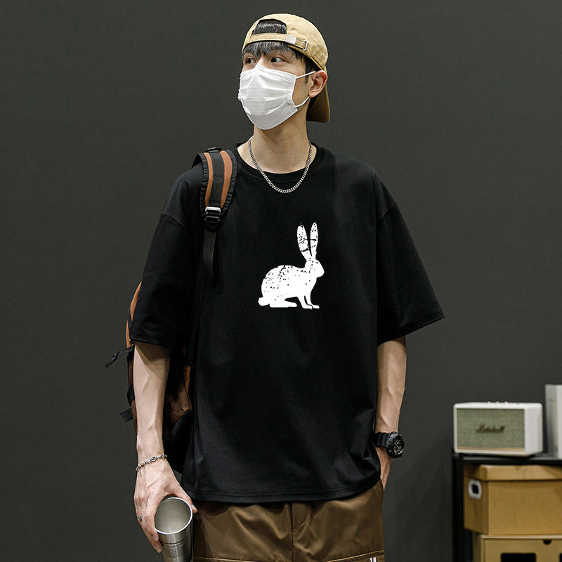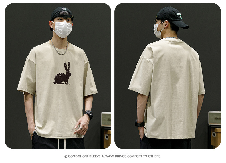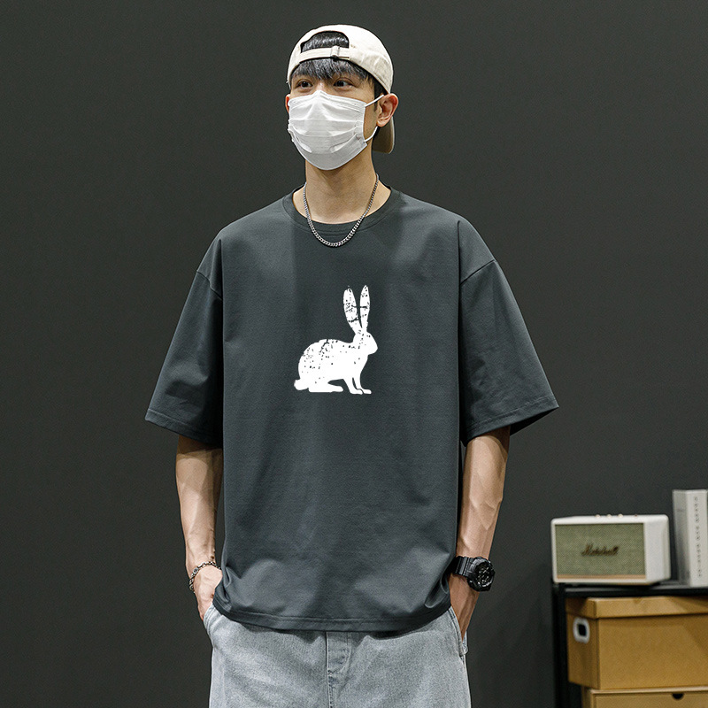 夏季情侣套头圆领短袖T恤男士兔子休闲宽松重磅落肩白色港风打底t