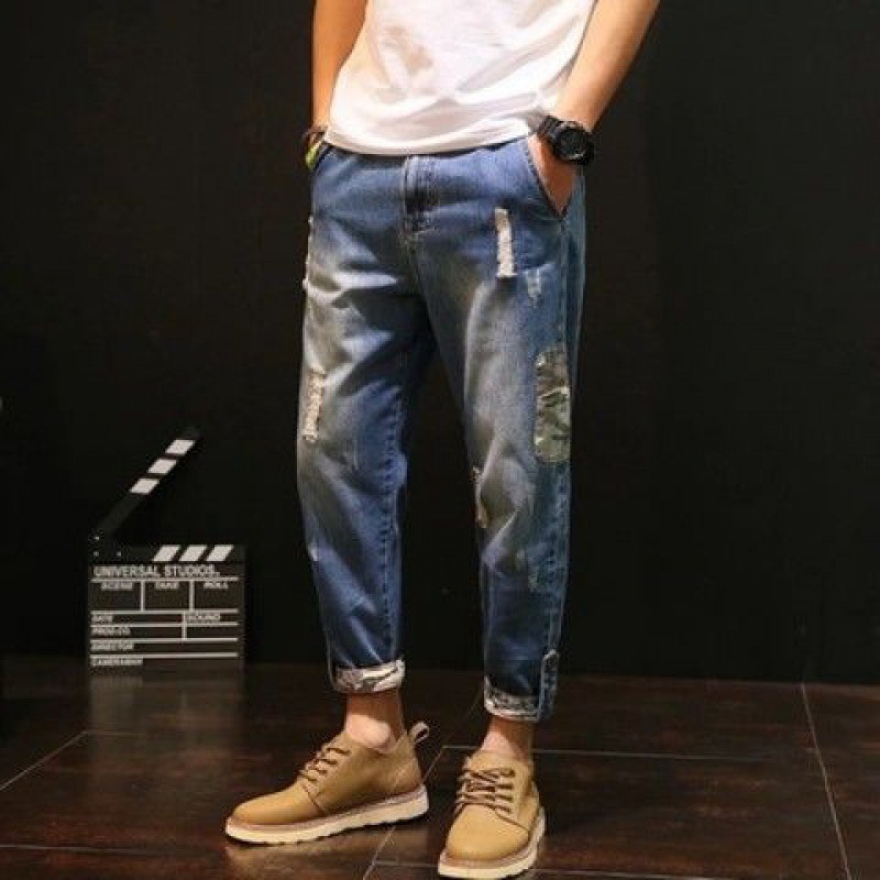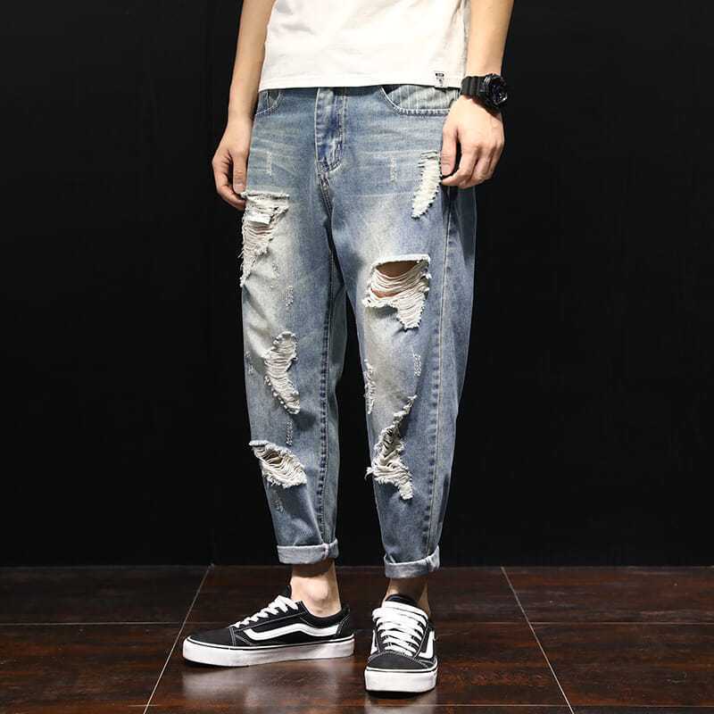 夏季破洞牛仔裤男宽松大码哈伦9九分乞丐裤胖子粗腿8八分裤薄款潮