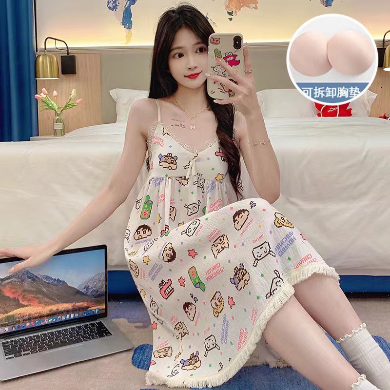 夏季新款带胸垫睡衣女泡泡棉流苏吊带睡裙甜美舒适连衣裙家居服