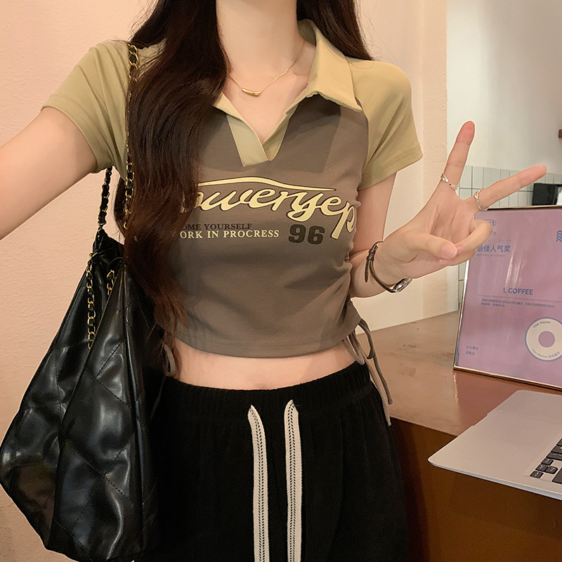 小心机设计感短款上衣女气质POLO领夏季小众修身显瘦辣妹抽绳t恤