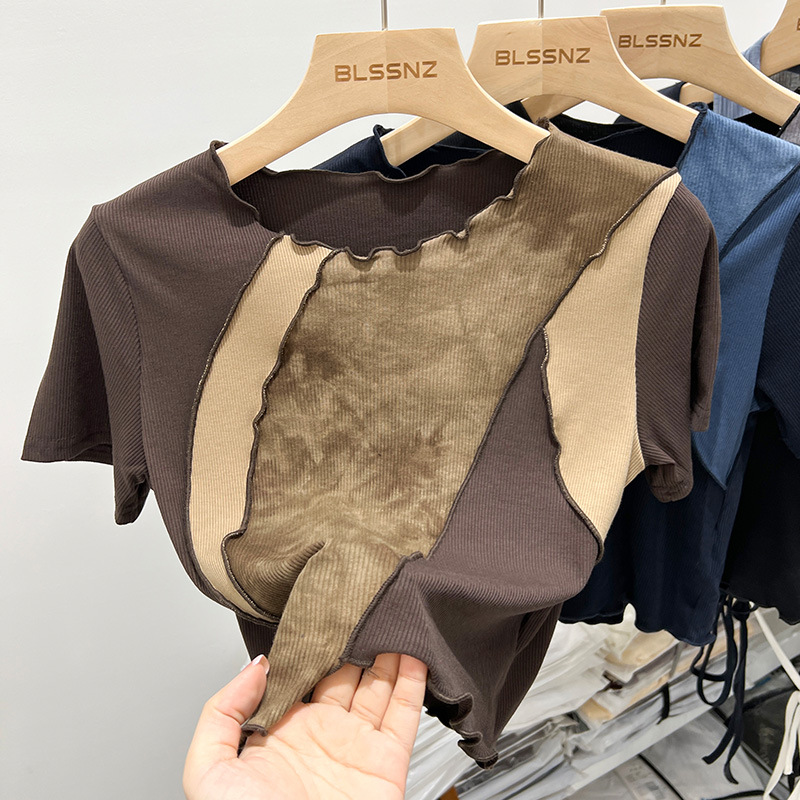 不规则撞色短袖t恤女ins潮木耳边短款高腰露脐设计感小众上衣