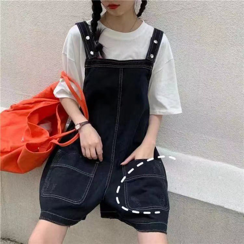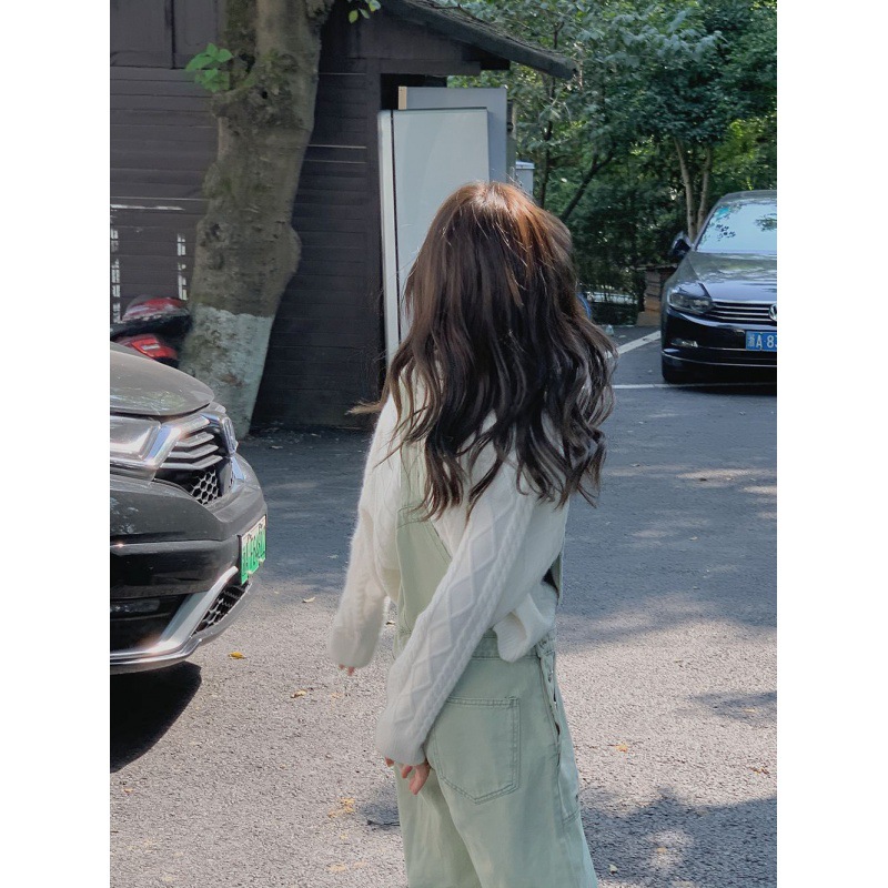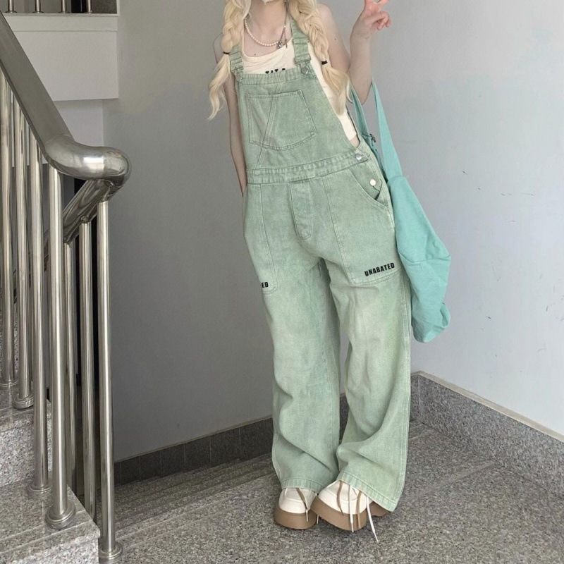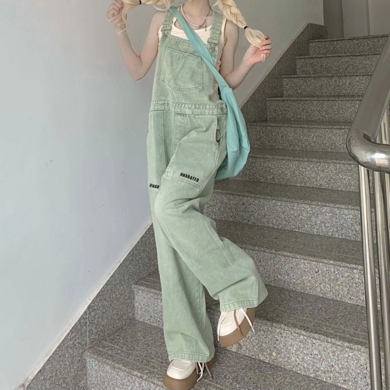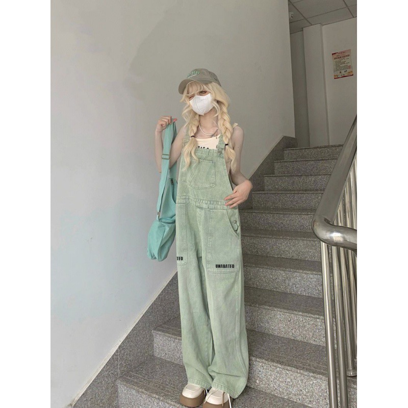 复古浅绿牛仔背带裤女春夏韩版百搭设计感宽松显瘦阔腿连体裤子潮
