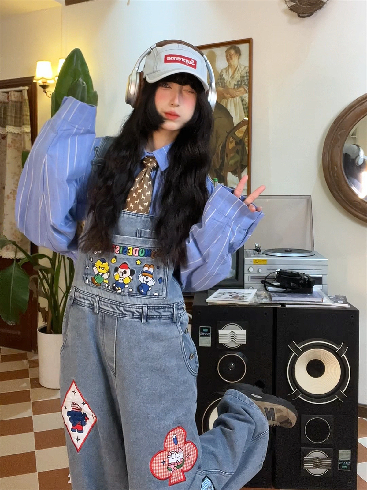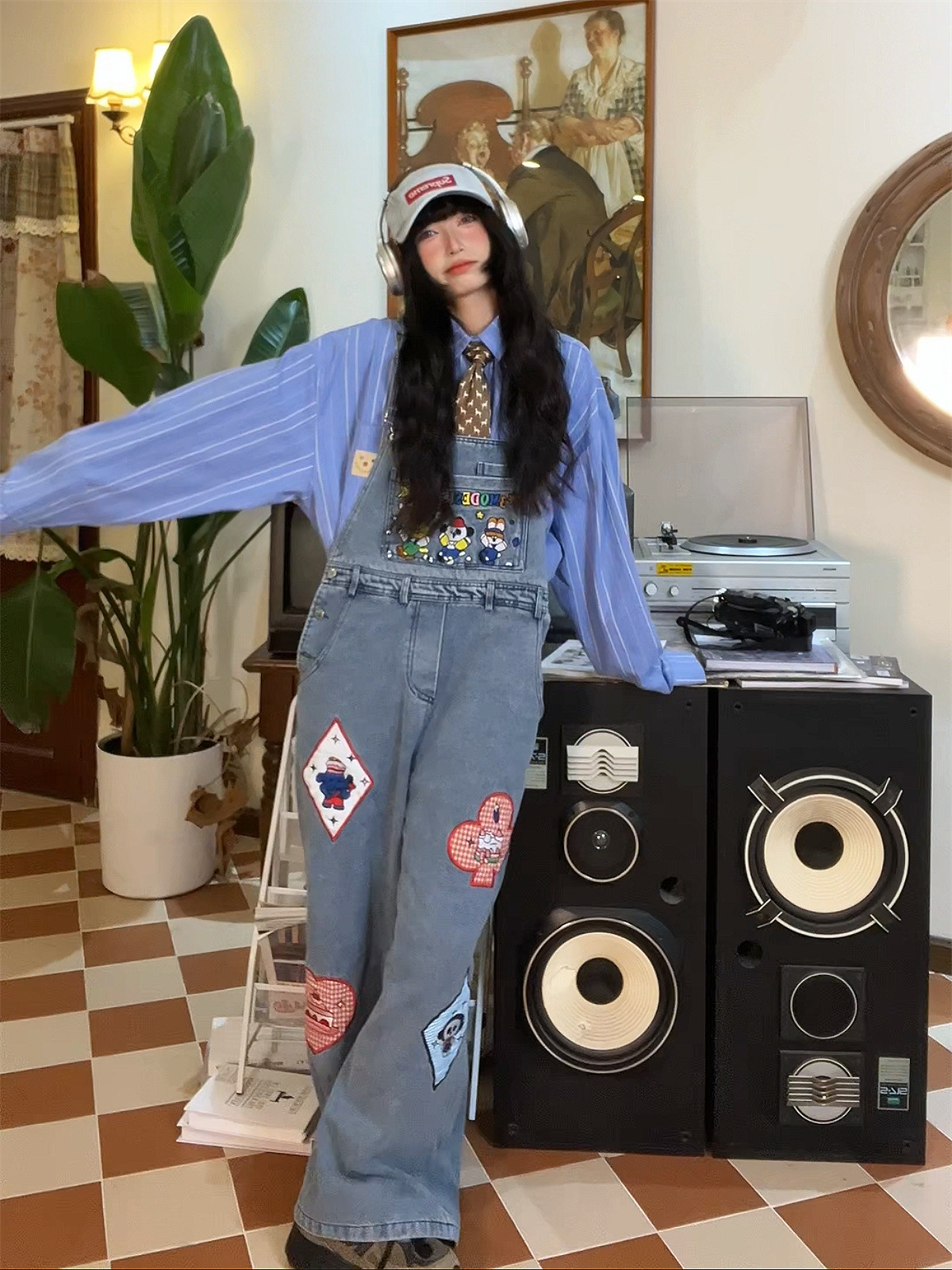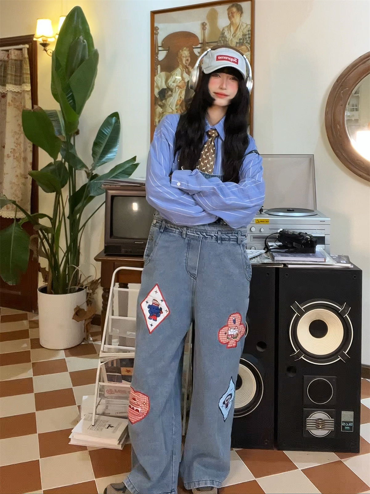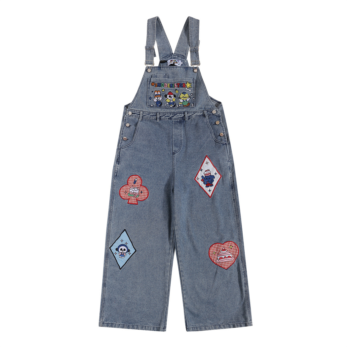 贴布爱心复古牛仔背带裤女春夏新款宽松小个子可爱显瘦阔腿裤