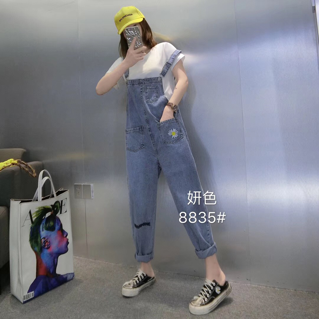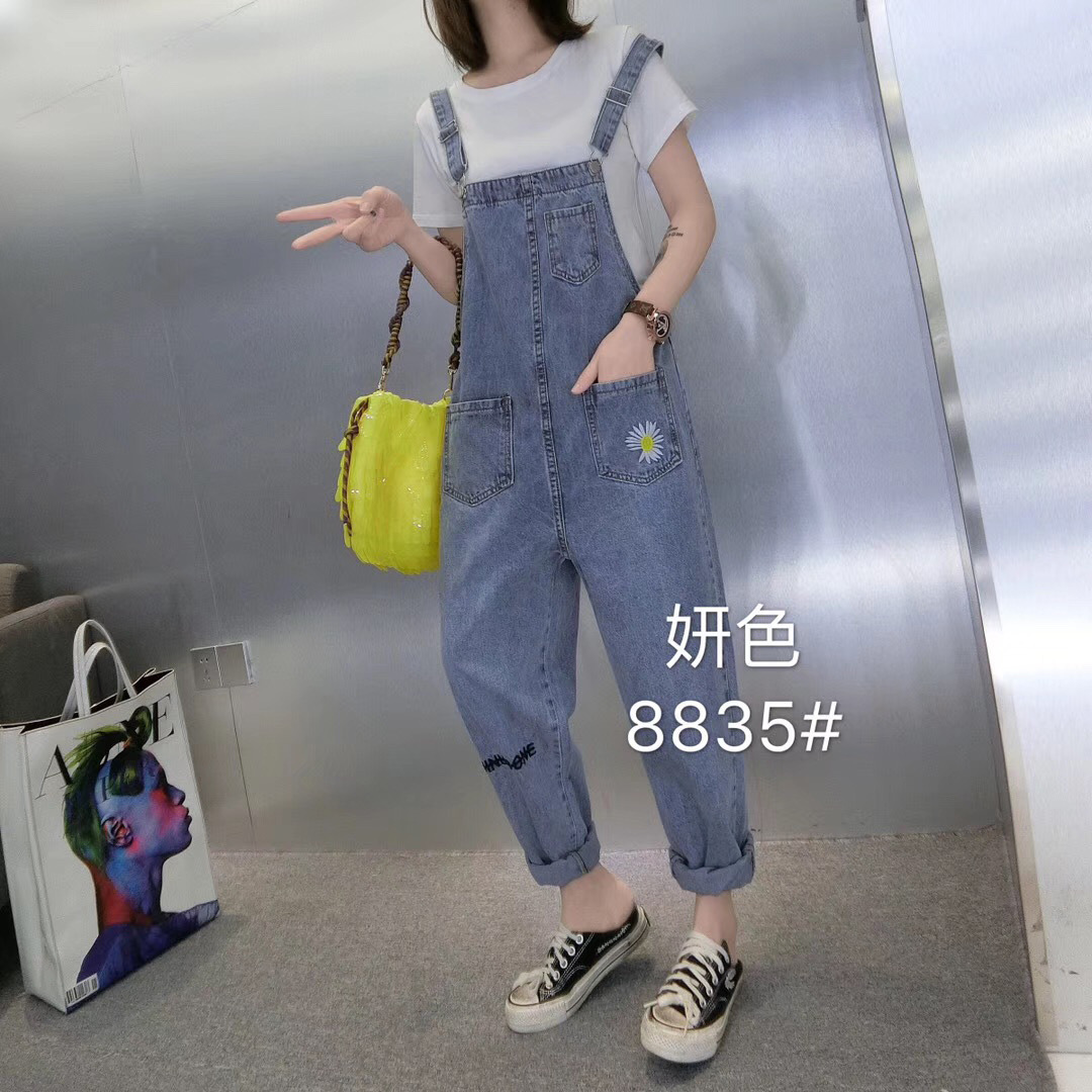 新款小雏菊刺绣减龄牛仔背带裤女春夏学生韩版宽松九分连体裤