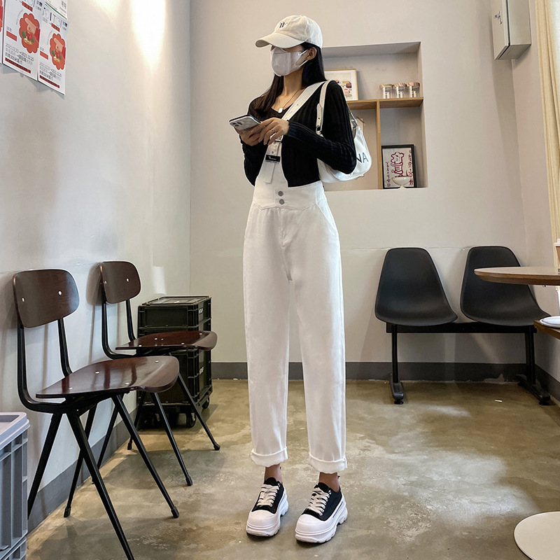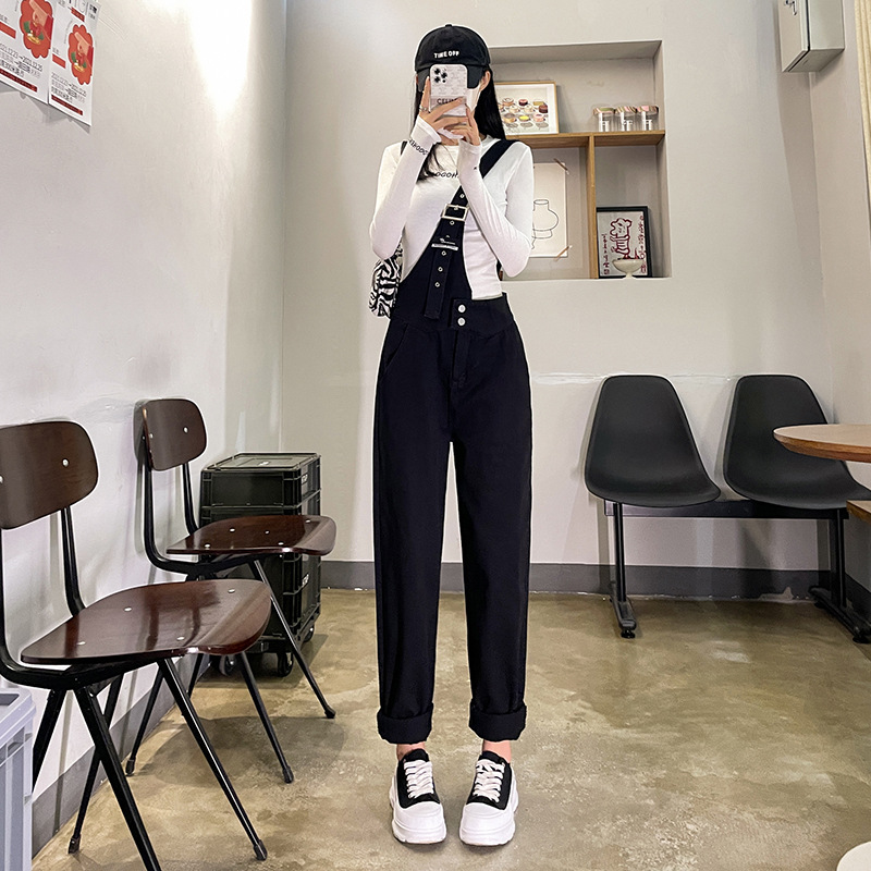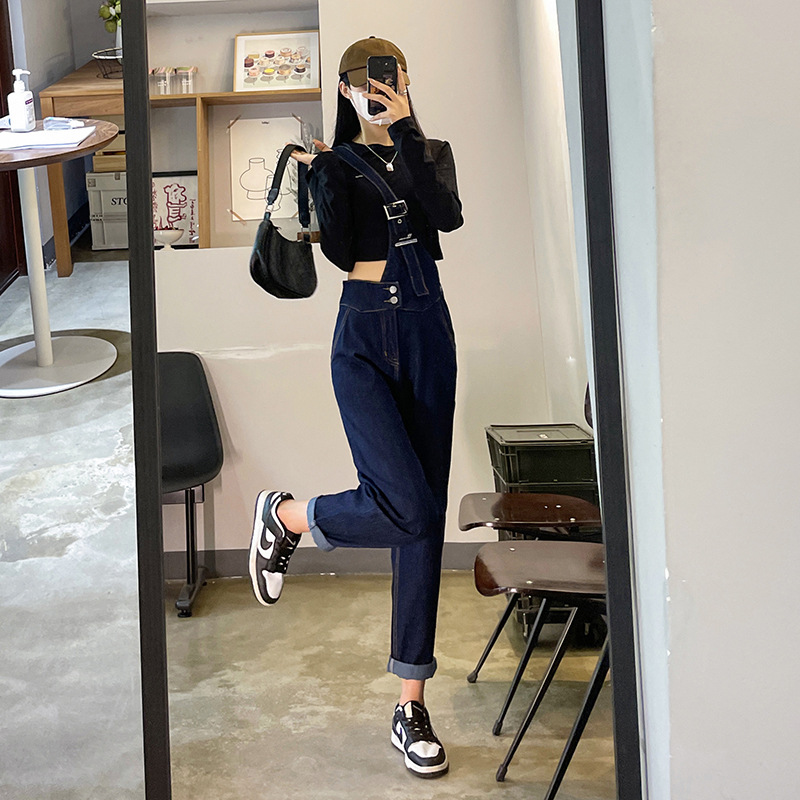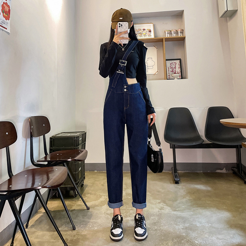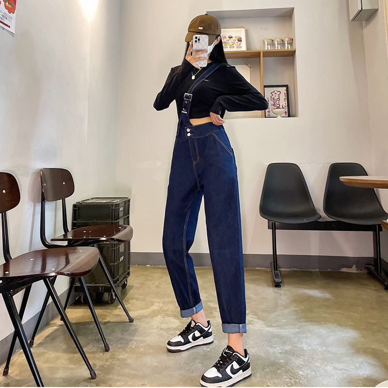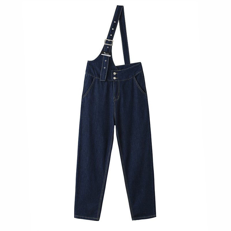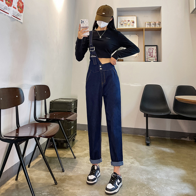 韩版休闲盐系单肩带牛仔背带裤女春夏小个子显瘦时尚哈伦裤女