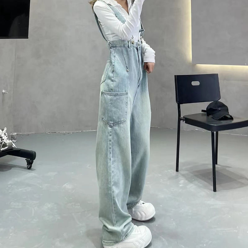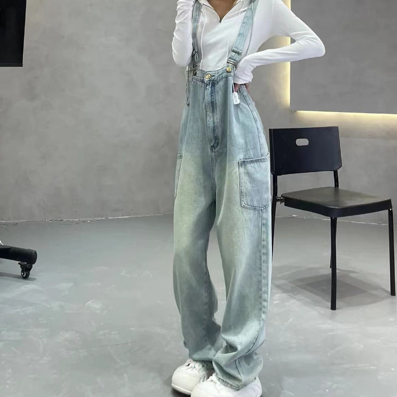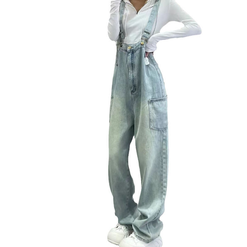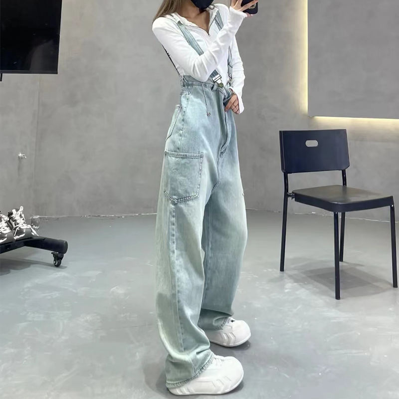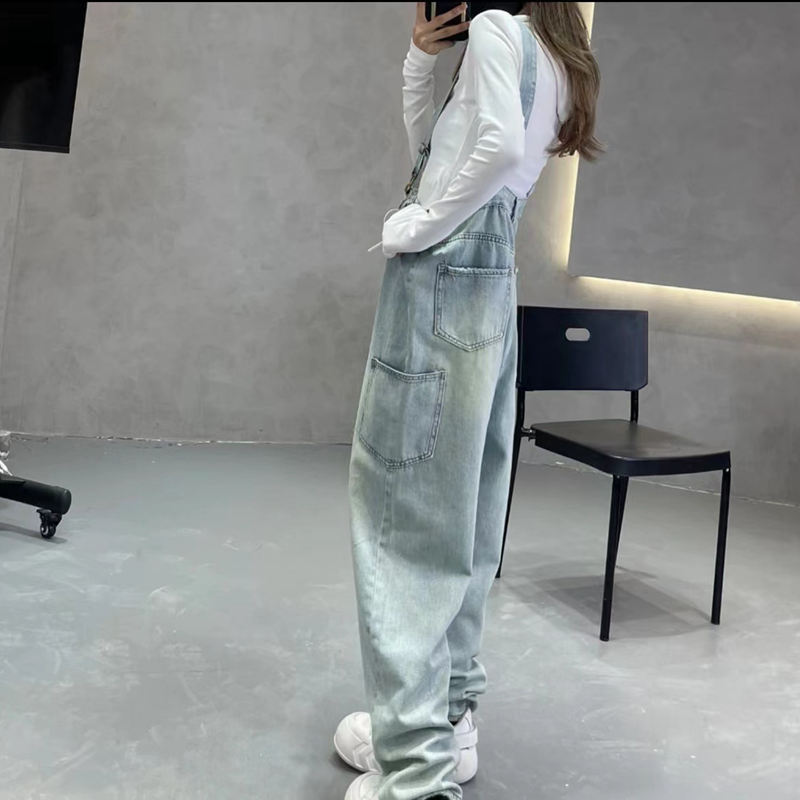 浅色水洗磨白牛仔背带裤女春夏新款宽松减龄高腰连体阔腿裤