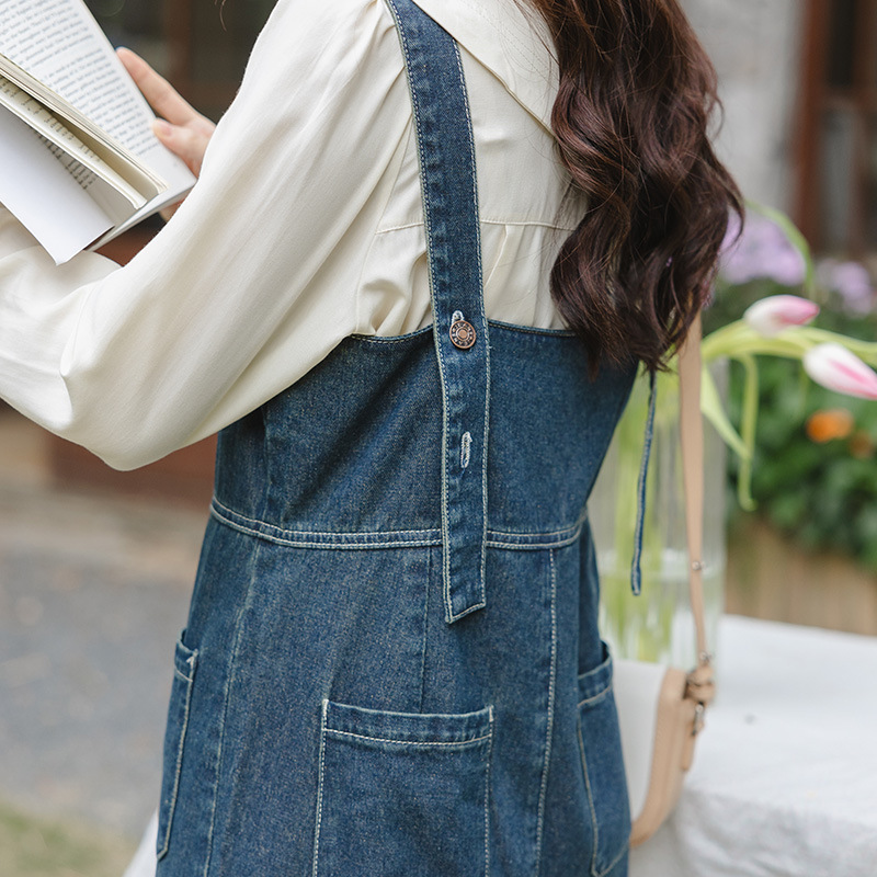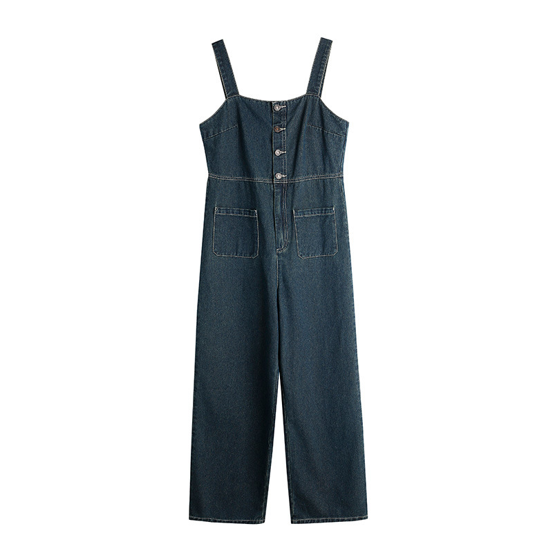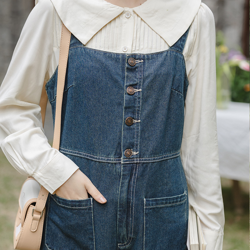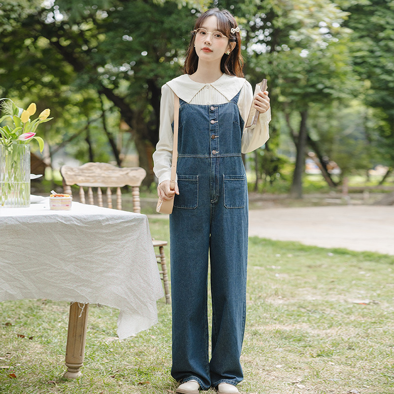 春夏新款韩版学院宽松双口袋吊带连体裤牛仔背带长裤阔腿裤女