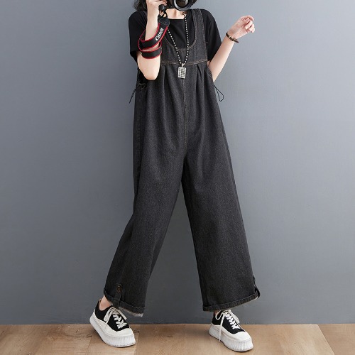 夏款大码牛仔背带裤女士宽松直筒吊带连体裤阔腿长裤