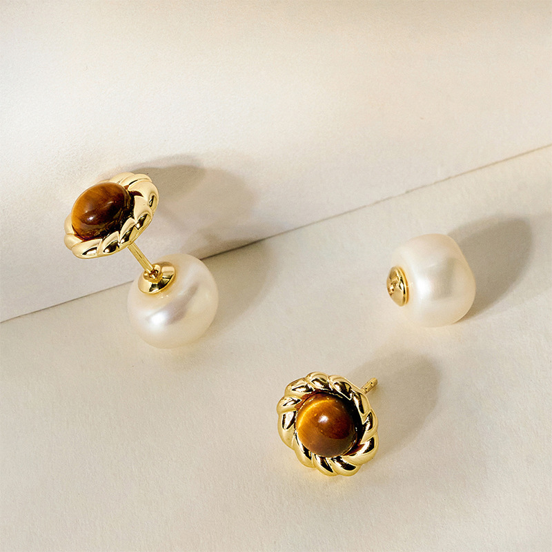 小红书爆款珍珠虎眼石焦糖咖啡耳钉2025新款双面佩戴耳饰一件代发
