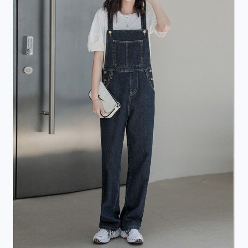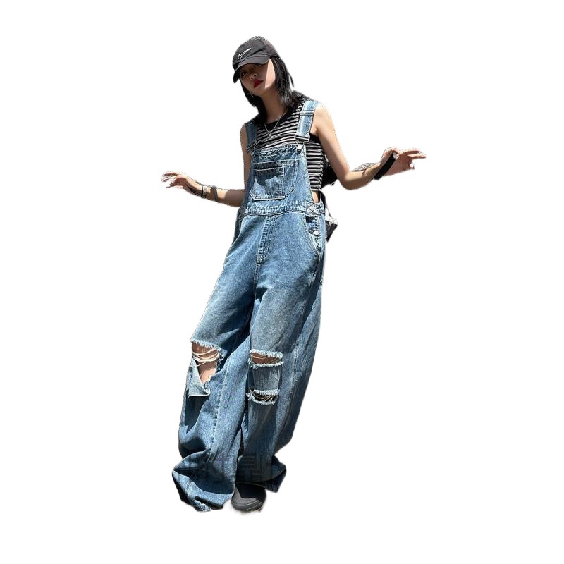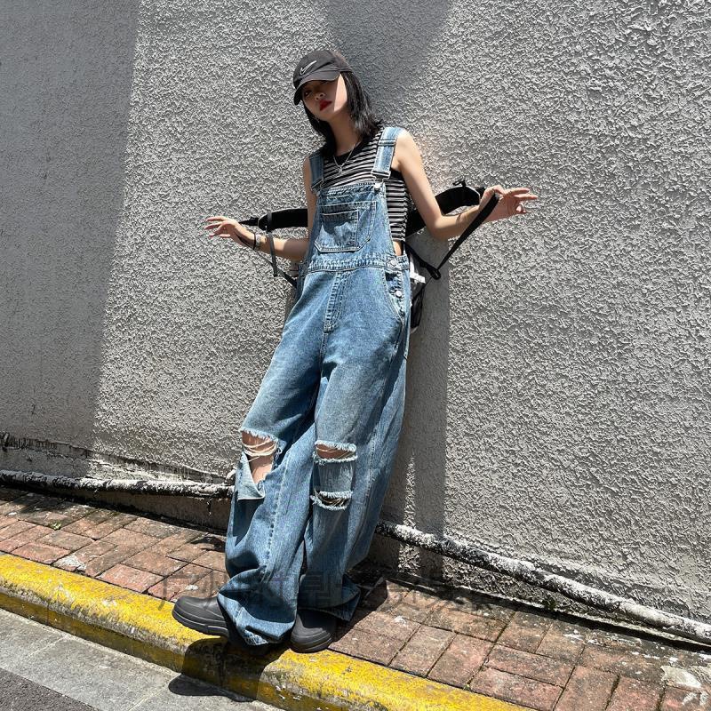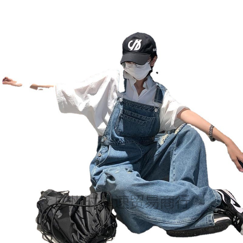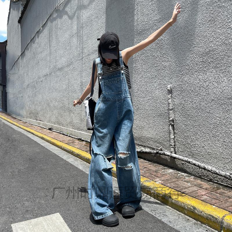 背带裤破洞牛仔女春夏新款韩版宽松直筒减龄显瘦阔腿裤连体裤