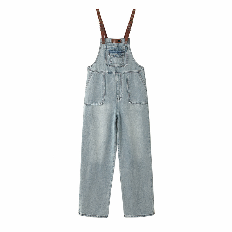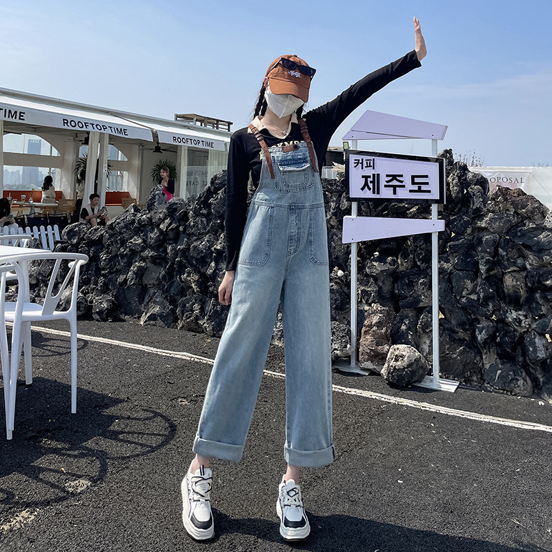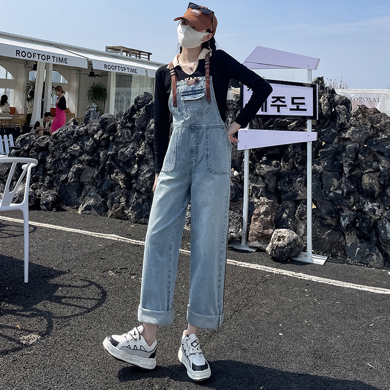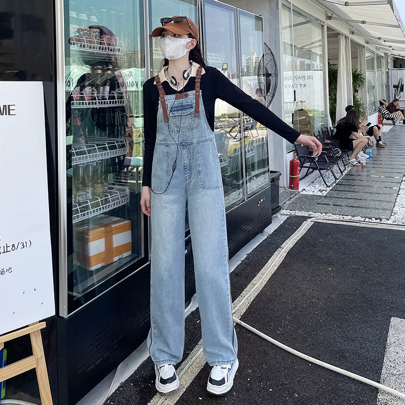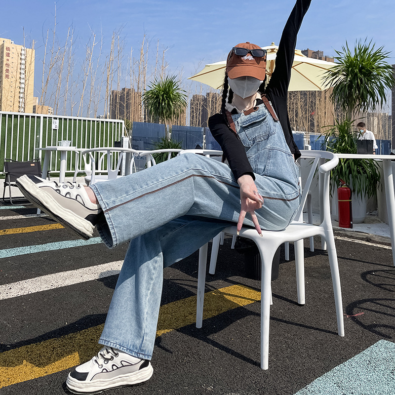春夏美式复古酷盐系背带裤小个子高腰宽松直筒显瘦牛仔裤女无