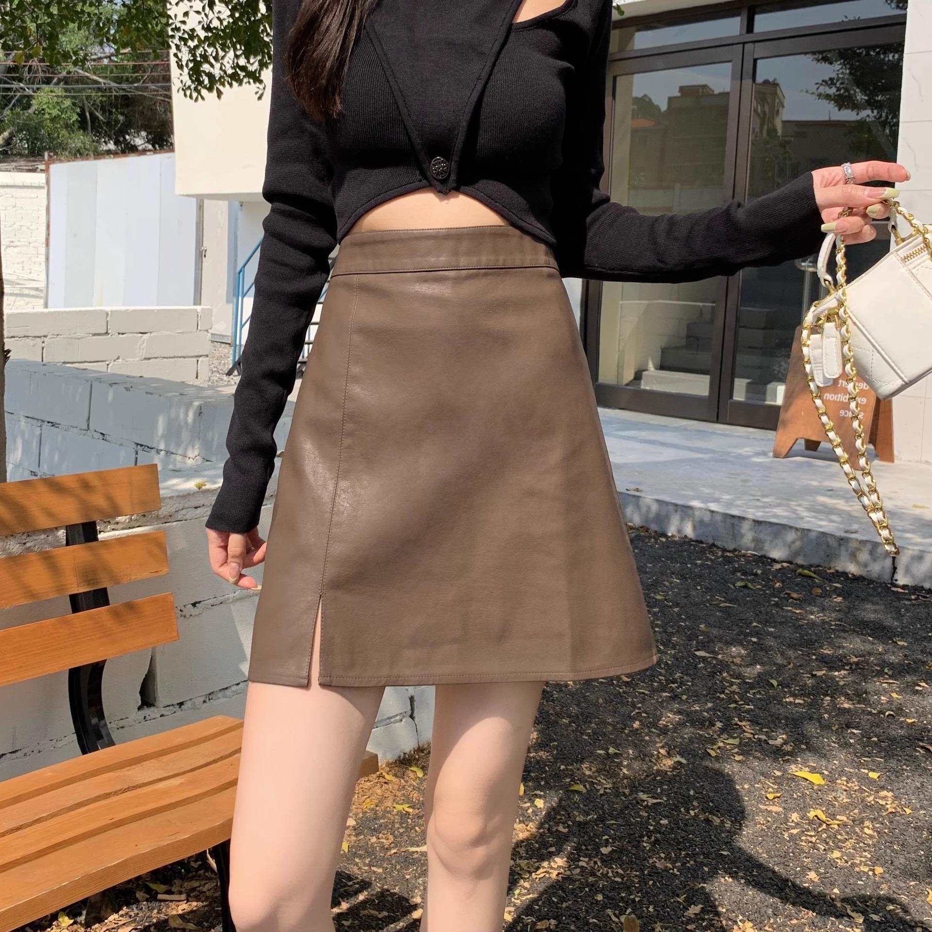 今年流行PU皮a字半身裙女高级感小个子高腰显瘦开叉包臀短裙